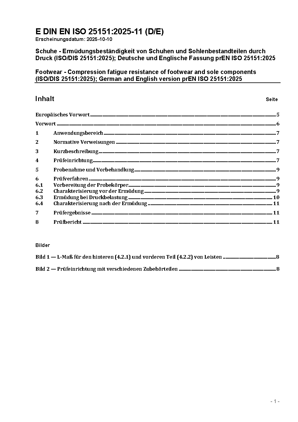 Schuhe - Ermüdungsbeständigkeit von Schuhen und Sohlenbestandteilen durch Druck (ISO/DIS 25151:2025); Deutsche und Englische Fassung prEN ISO 25151:2025