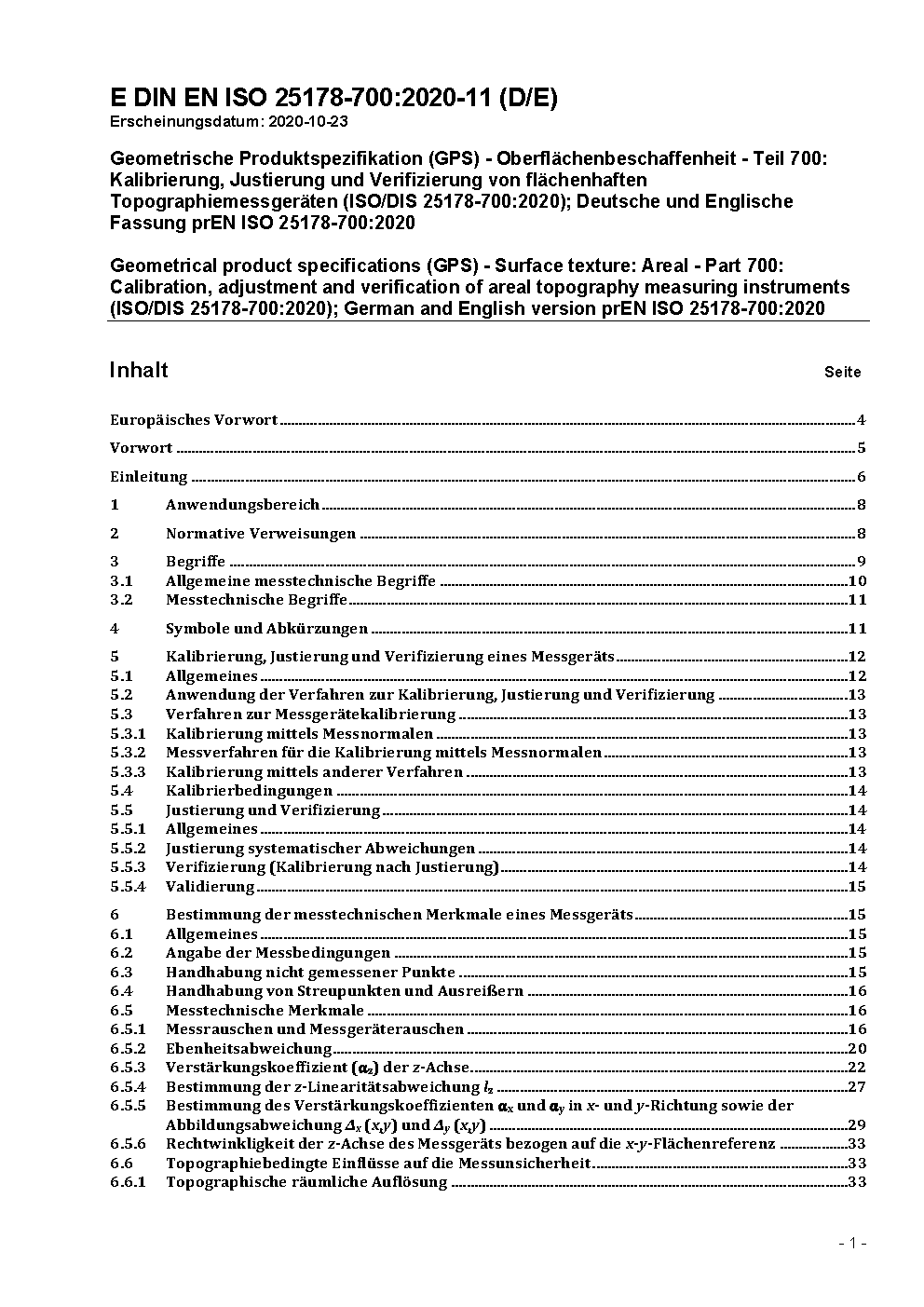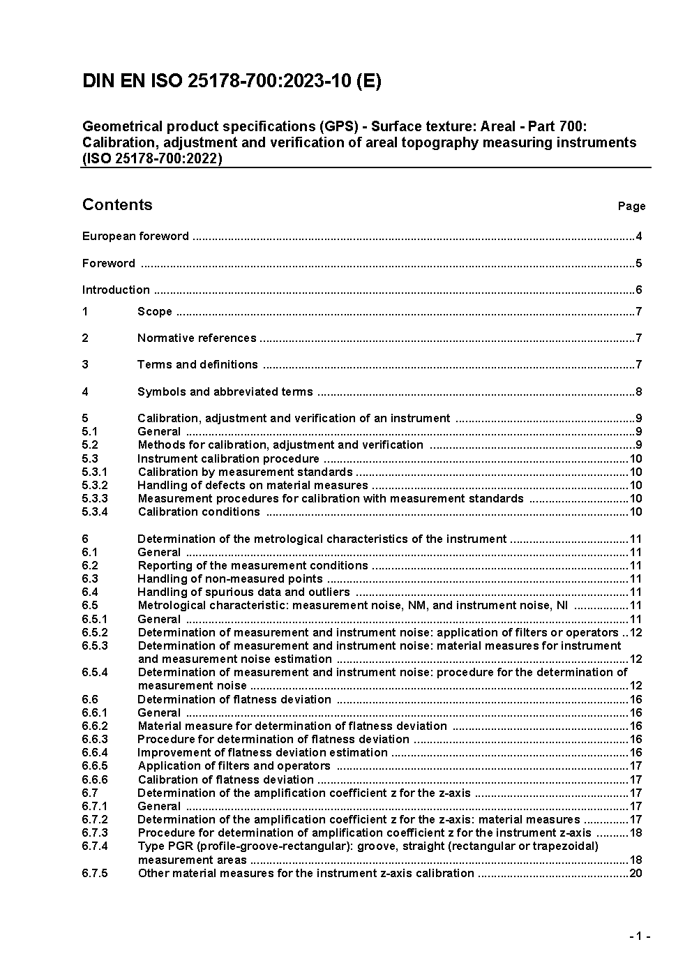 Geometrical product specifications (GPS) - Surface texture: Areal - Part 700: Calibration, adjustment and verification of areal topography measuring instruments (ISO 25178-700:2022); German version EN ISO 25178-700:2023