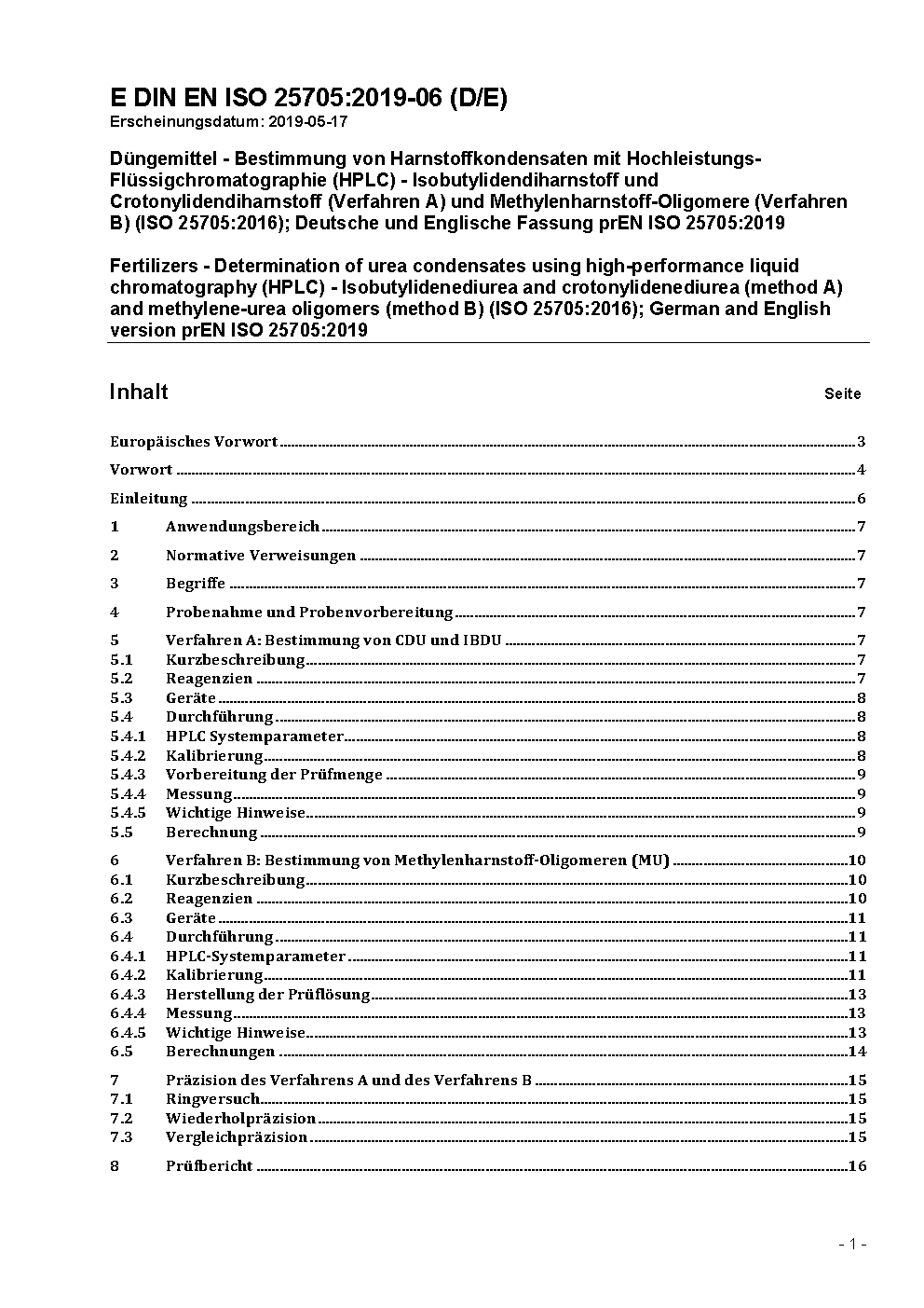 Düngemittel - Bestimmung von Harnstoffkondensaten mit Hochleistungs-Flüssigchromatographie (HPLC) - Isobutylidendiharnstoff und Crotonylidendiharnstoff (Verfahren A) und Methylenharnstoff-Oligomere (Verfahren B) (ISO 25705:2016); Deutsche und Englische Fassung prEN ISO 25705:2019