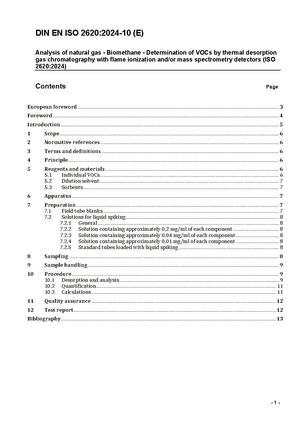 Analysis of natural gas - Biomethane - Determination of VOCs by thermal desorption gas chromatography with flame ionization and/or mass spectrometry detectors (ISO 2620:2024); German version EN ISO 2620:2024