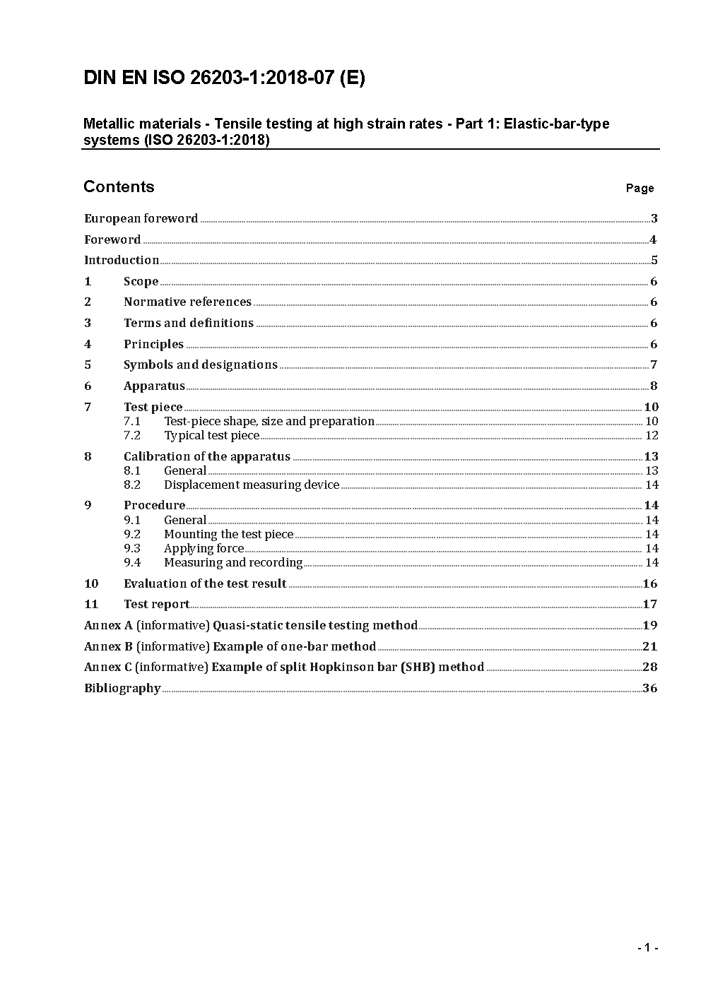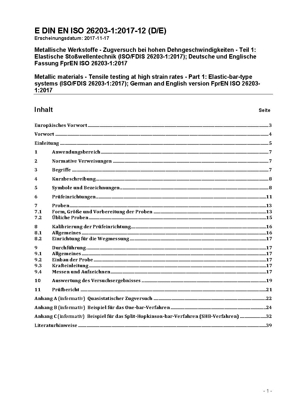 Metallic materials - Tensile testing at high strain rates - Part 1: Elastic-bar-type systems (ISO 26203-1:2018); German version EN ISO 26203-1:2018
