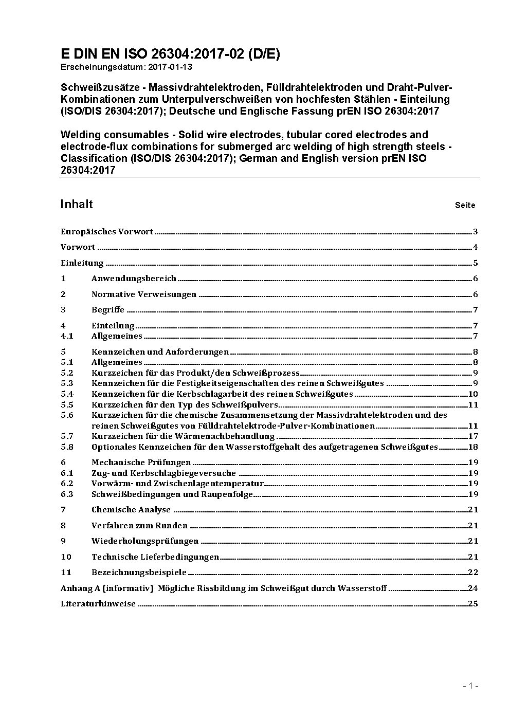 Schweißzusätze - Massivdrahtelektroden, Fülldrahtelektroden und Draht-Pulver-Kombinationen zum Unterpulverschweißen von hochfesten Stählen - Einteilung (ISO/DIS 26304:2017); Deutsche und Englische Fassung prEN ISO 26304:2017