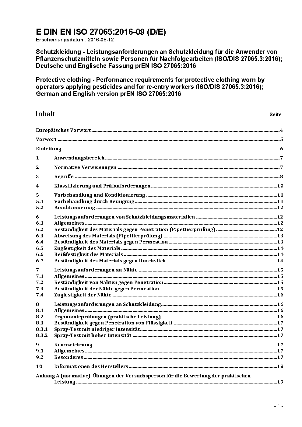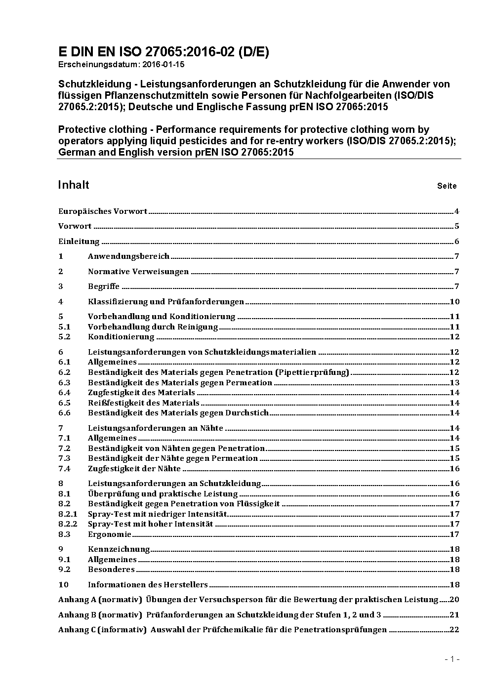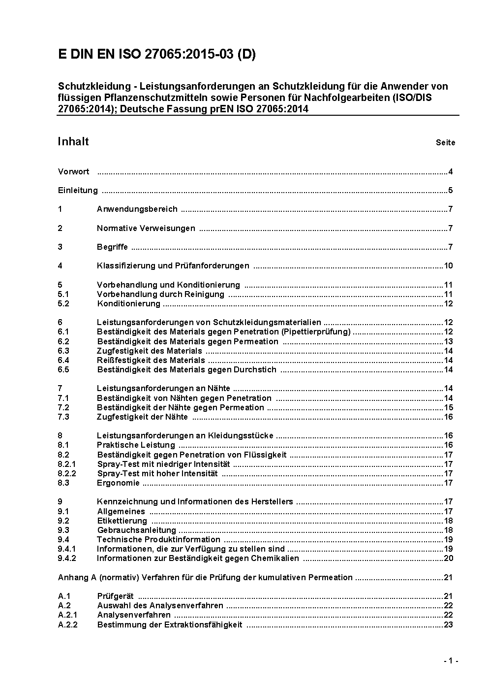 Schutzkleidung - Leistungsanforderungen an Schutzkleidung für die Anwender von flüssigen Pflanzenschutzmitteln sowie Personen für Nachfolgearbeiten (ISO/DIS 27065:2014); Deutsche Fassung prEN ISO 27065:2014