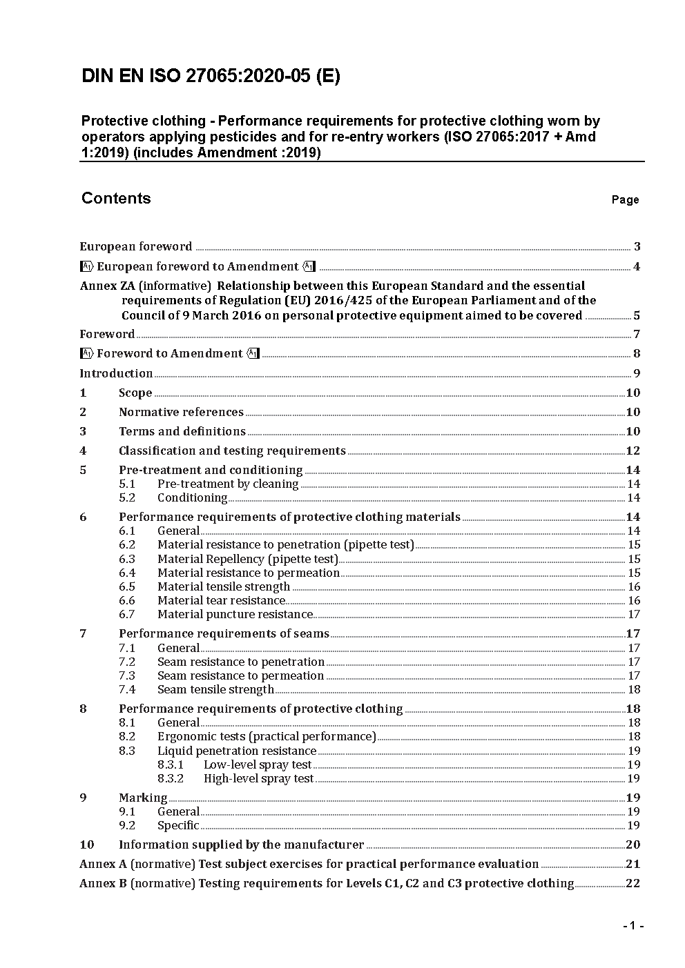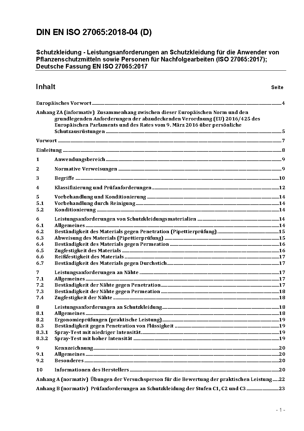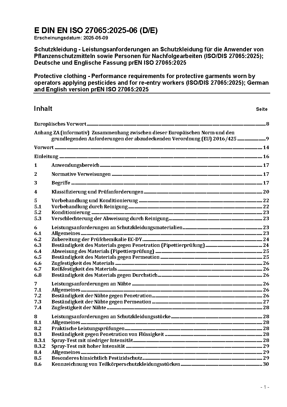 Schutzkleidung - Leistungsanforderungen an Schutzkleidung für die Anwender von flüssigen Pflanzenschutzmitteln sowie Personen für Nachfolgearbeiten (ISO/DIS 27065:2014); Deutsche Fassung prEN ISO 27065:2014