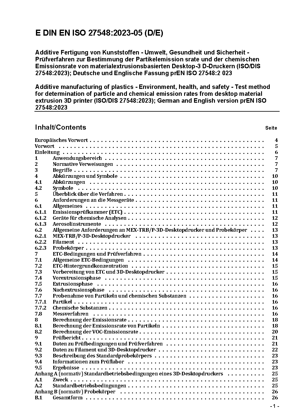 Additive Fertigung von Kunststoffen - Umwelt, Gesundheit und Sicherheit - Prüfverfahren zur Bestimmung der Partikelemissionsrate und der chemischen Emissionsrate von materialextrusionsbasierten Desktop-3D-Druckern (ISO/DIS 27548:2023); Deutsche und Englische Fassung prEN ISO 27548:2023