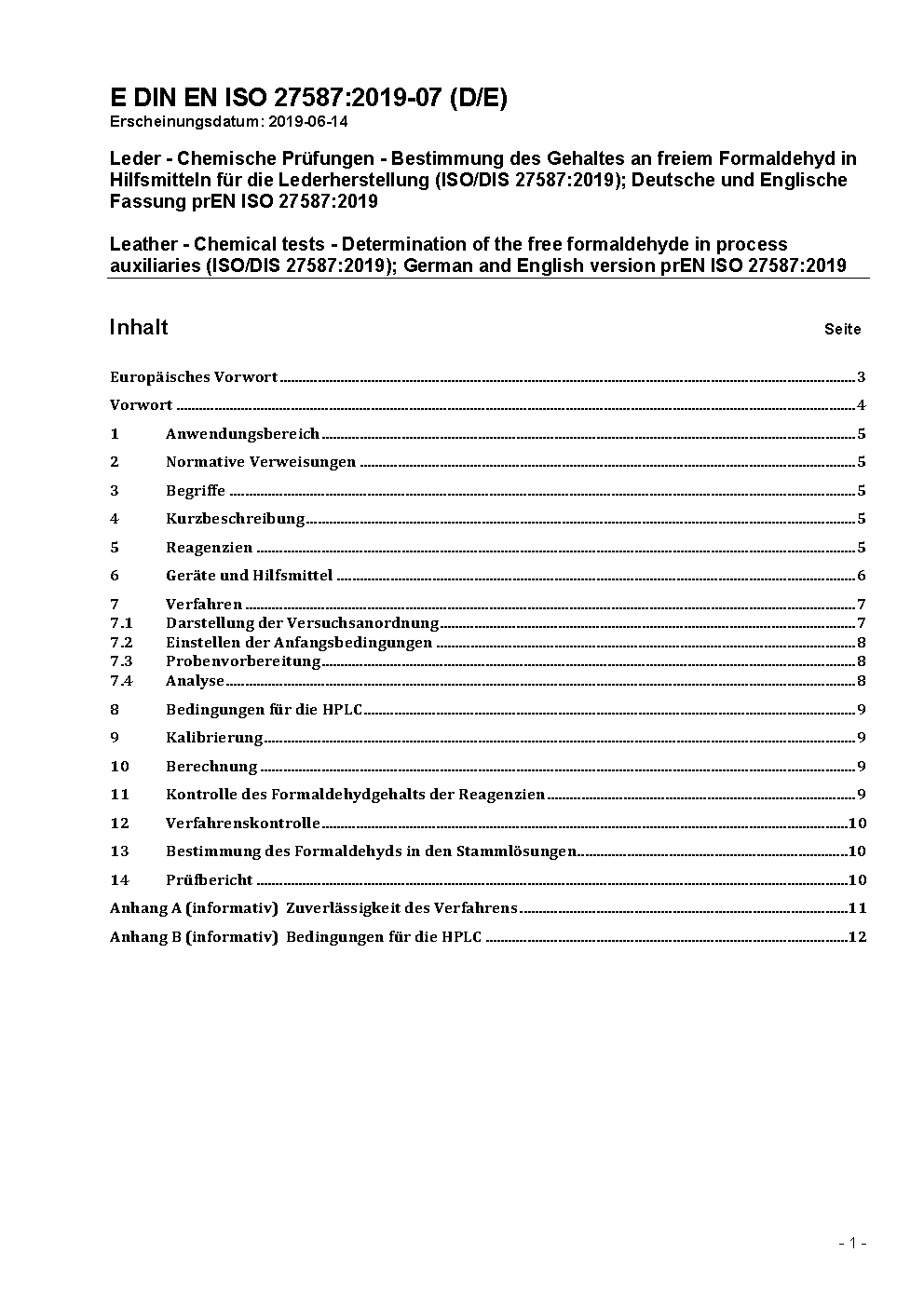 Leder - Chemische Prüfungen - Bestimmung des Gehaltes an freiem Formaldehyd in Hilfsmitteln für die Lederherstellung (ISO 27587:2009); Deutsche Fassung EN ISO 27587:2009