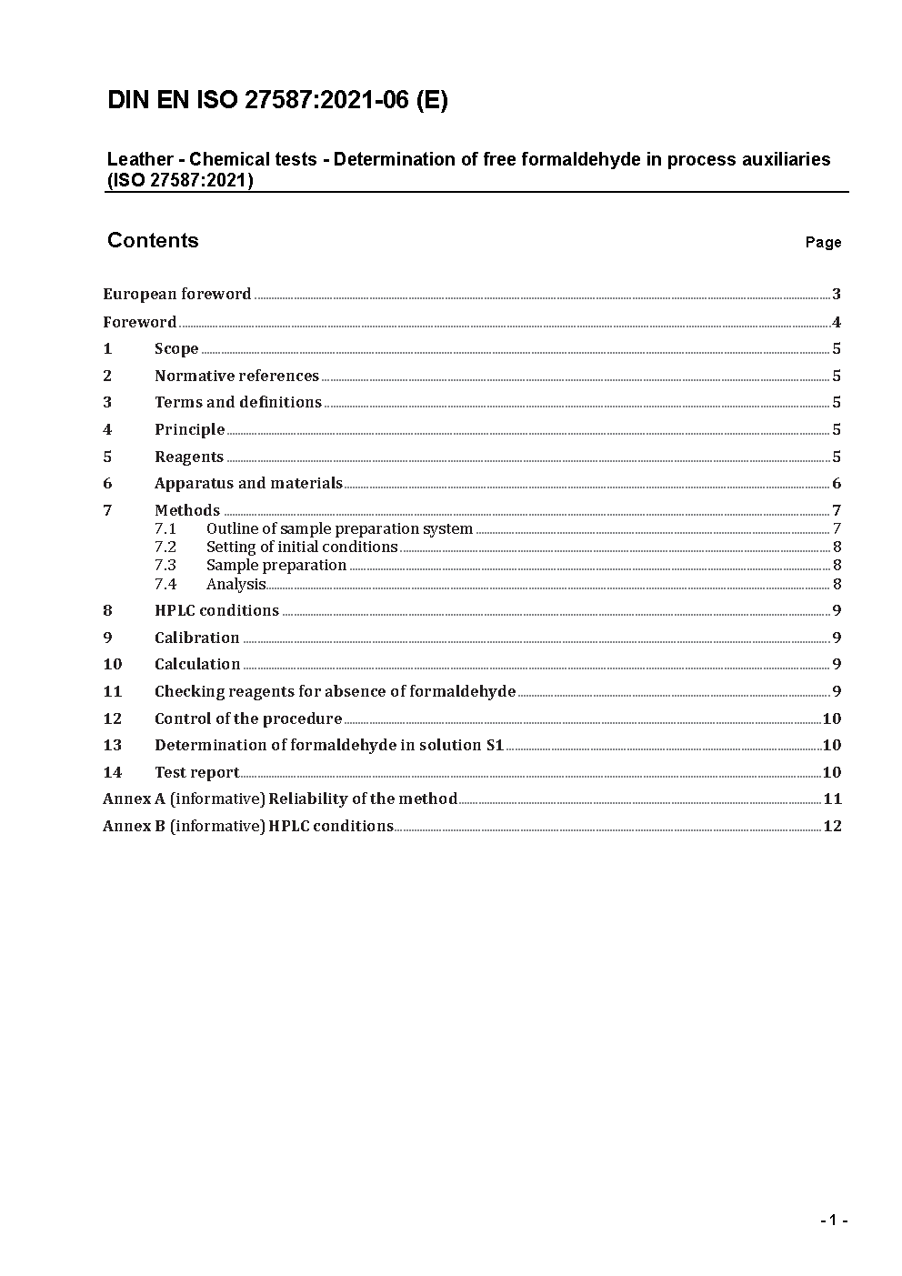 Leather - Chemical tests - Determination of the free formaldehyde in process auxiliaries (ISO 27587:2009); German version EN ISO 27587:2009