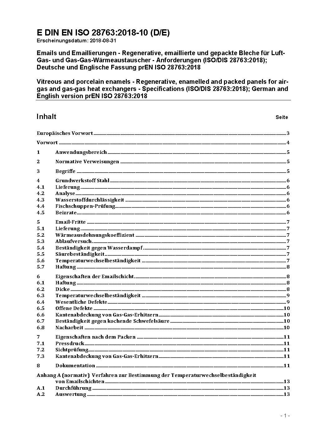 Emails und Emaillierungen - Regenerative, emaillierte und gepackte Bleche für Luft-Gas- und Gas-Gas-Wärmeaustauscher - Anforderungen (ISO 28763:2008); Deutsche Fassung EN ISO 28763:2011