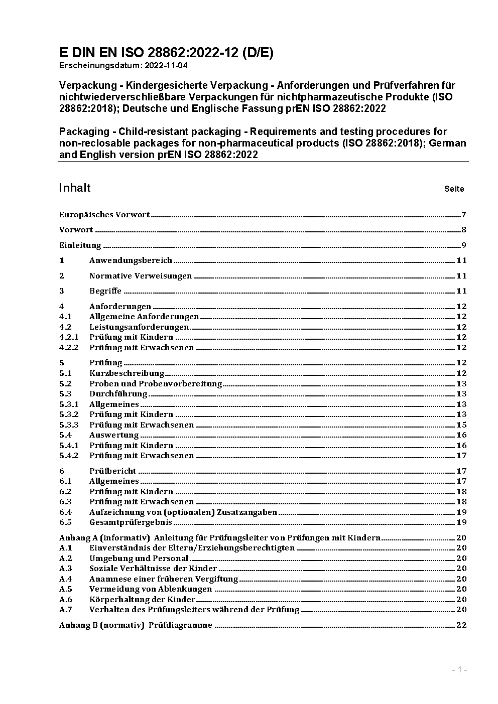 Packaging - Child-resistant packaging - Requirements and testing procedures for non-reclosable packages for non-pharmaceutical products (ISO 28862:2018); German and English version prEN ISO 28862:2022