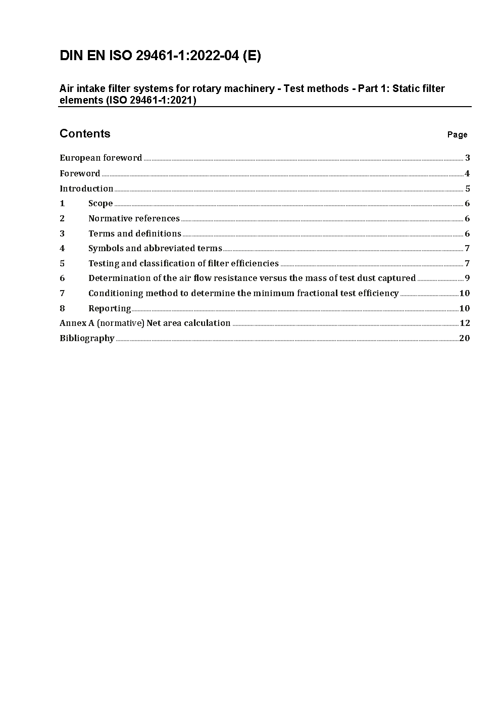 Air intake filter systems for rotary machinery - Test methods - Part 1: Static filter elements (ISO/DIS 29461-1:2010); German version prEN ISO 29461-1:2010