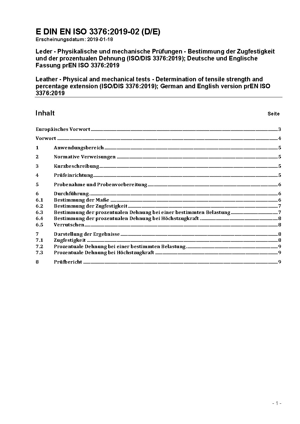 Leder - Physikalische und mechanische Prüfungen - Bestimmung der Zugfestigkeit und der prozentualen Dehnung (ISO 3376:2011); Deutsche Fassung EN ISO 3376:2011