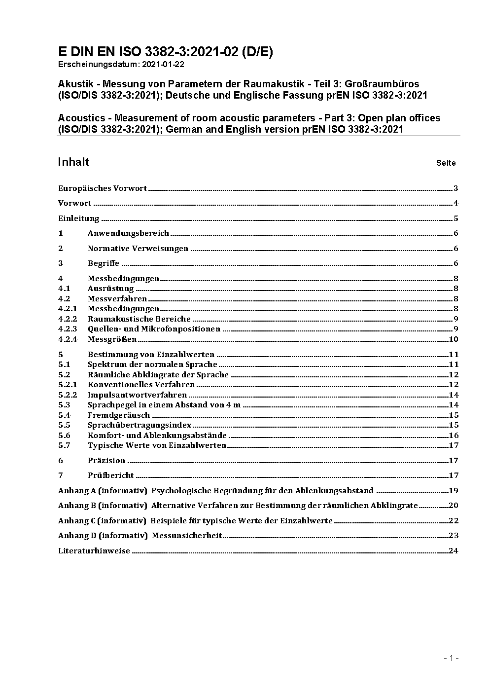Akustik - Messung von Parametern der Raumakustik - Teil 3: Großraumbüros (ISO 3382-3:2022); Deutsche Fassung EN ISO 3382-3:2022