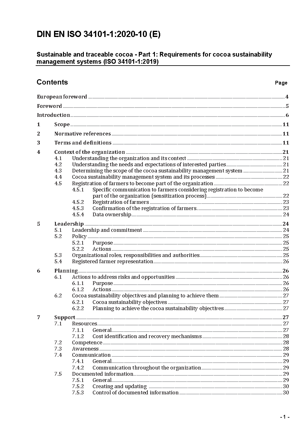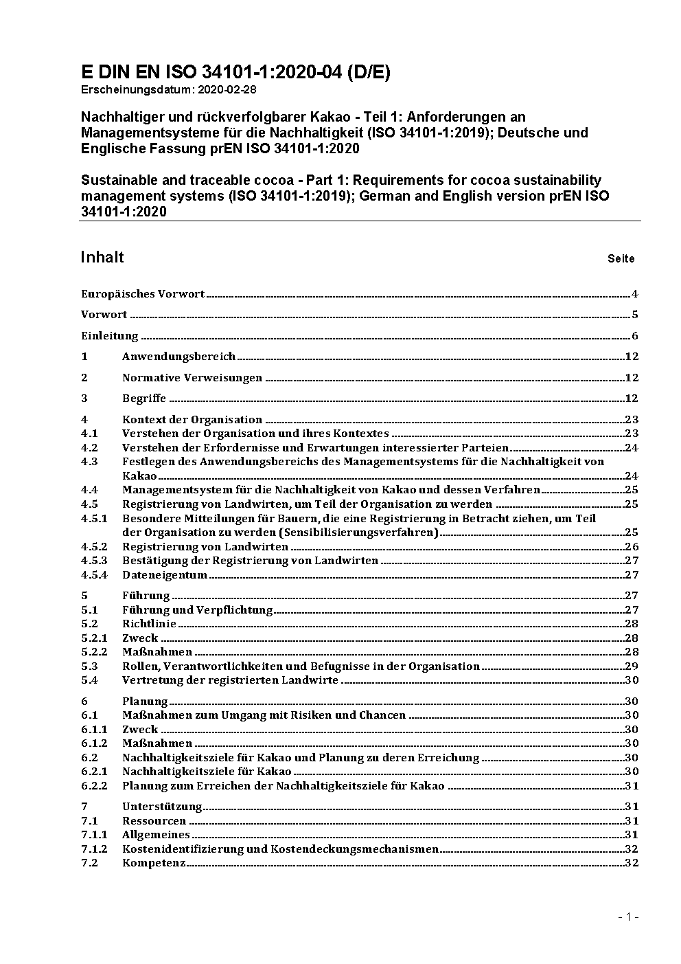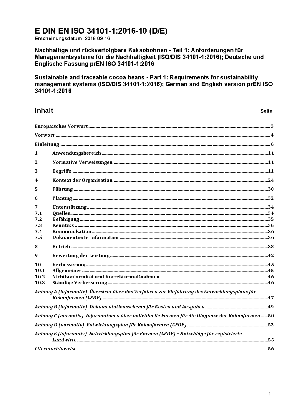 Sustainable and traceable cocoa beans - Part 1: Requirements for sustainability management systems (ISO/DIS 34101-1:2016); German and English version prEN ISO 34101-1:2016
