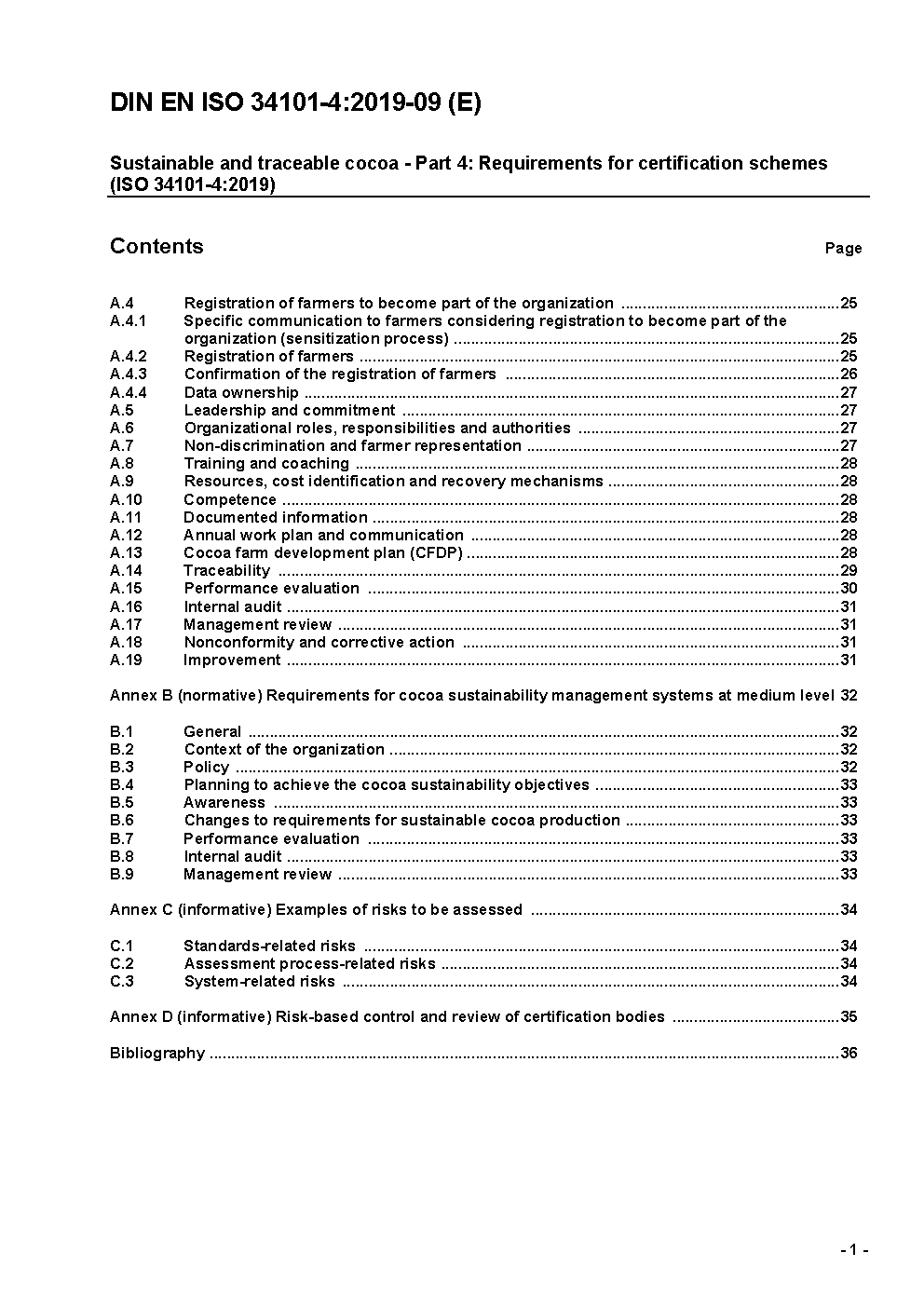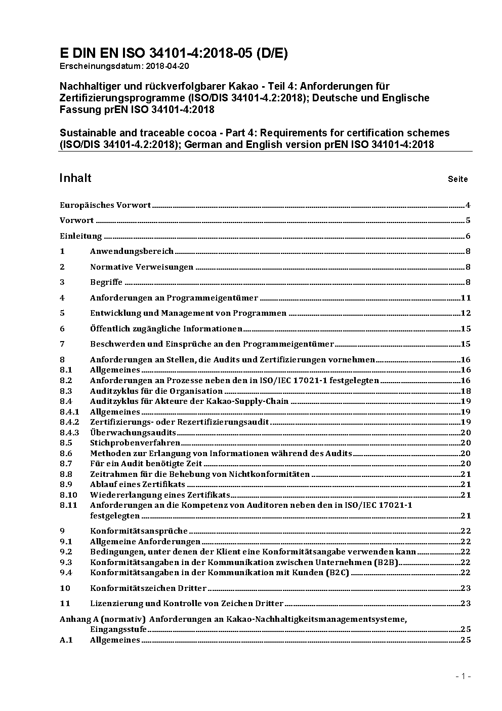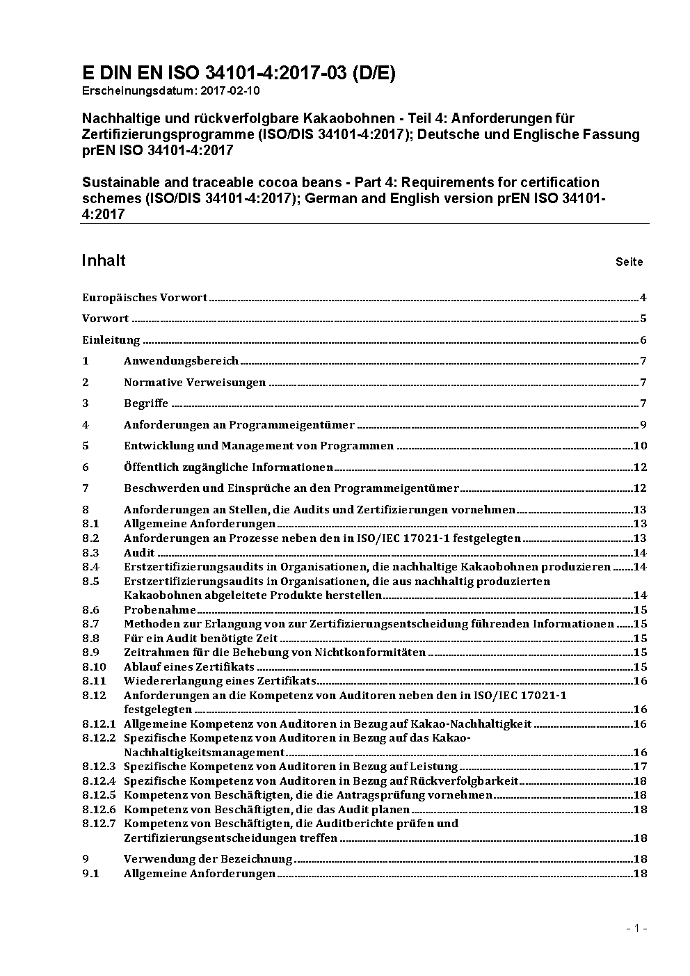 Sustainable and traceable cocoa - Part 4: Requirements for certification schemes (ISO/DIS 34101-4.2:2018); German and English version prEN ISO 34101-4:2018
