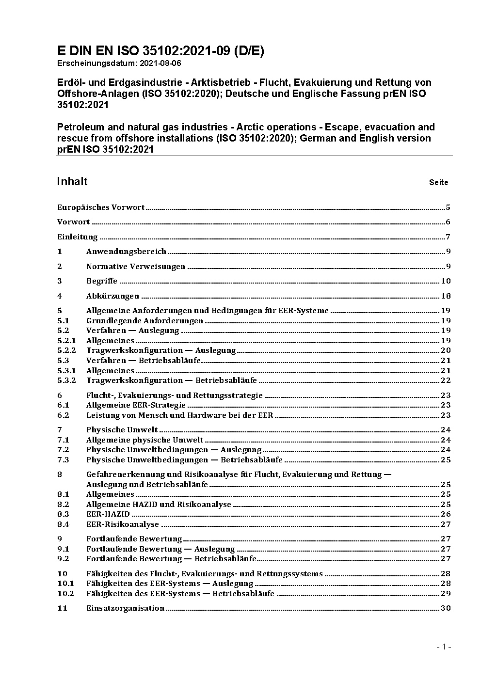 Erdöl- und Erdgasindustrie - Arktisbetrieb - Flucht, Evakuierung und Rettung von Offshore-Anlagen (ISO 35102:2020); Deutsche Fassung EN ISO 35102:2021