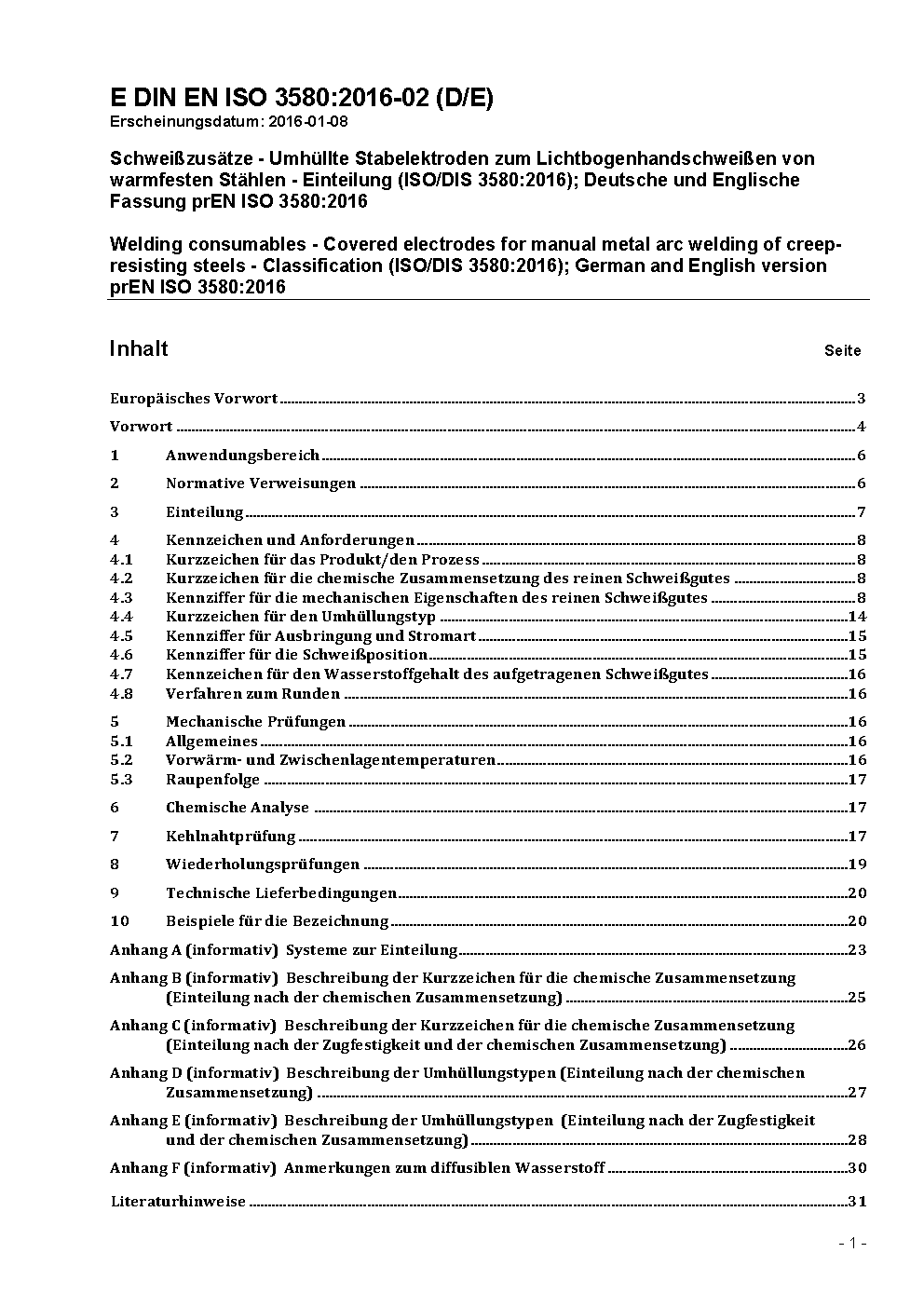 Schweißzusätze - Umhüllte Stabelektroden zum Lichtbogenhandschweißen von warmfesten Stählen - Einteilung (ISO 3580:2017); Deutsche Fassung EN ISO 3580:2017