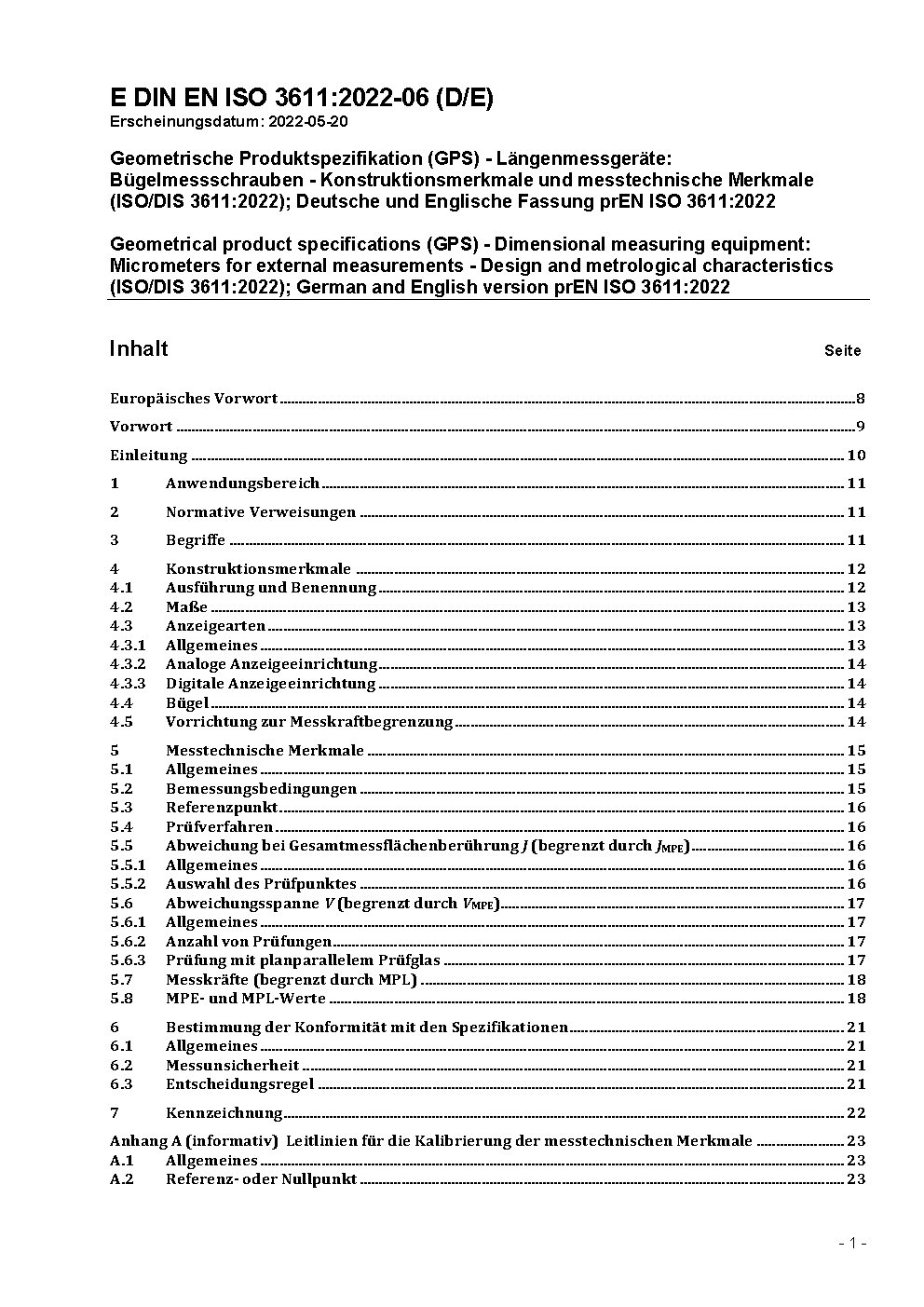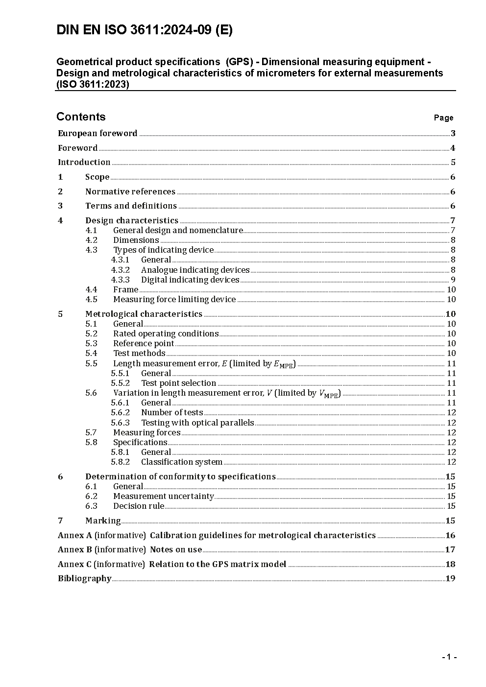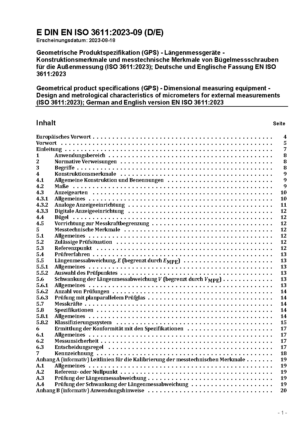 Geometrical product specifications (GPS) - Dimensional measuring equipment - Design and metrological characteristics of micrometers for external measurements (ISO 3611:2023); German and English version EN ISO 3611:2023