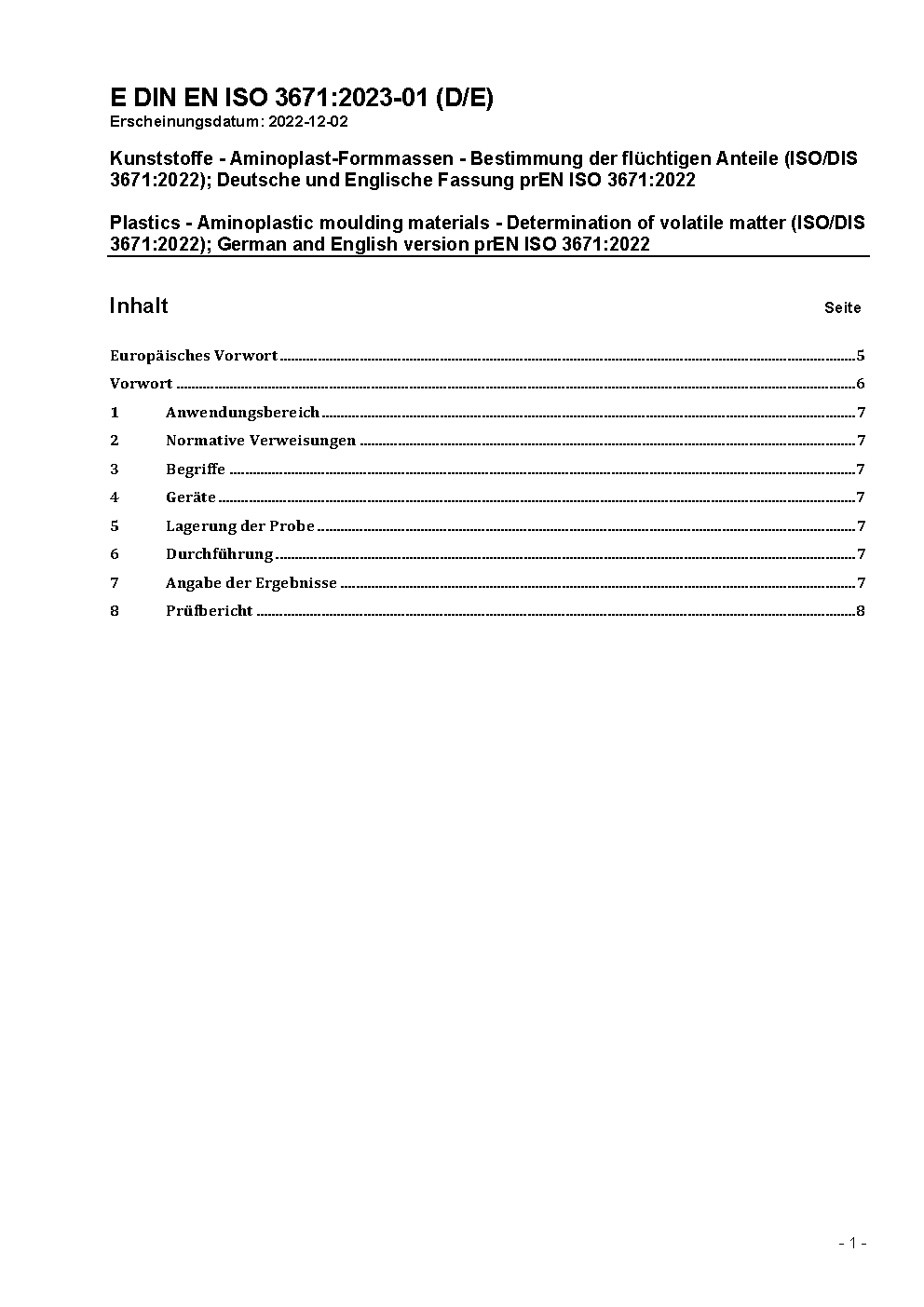 Kunststoffe - Aminoplast-Formmassen - Bestimmung der flüchtigen Anteile (ISO/DIS 3671:2022); Deutsche und Englische Fassung prEN ISO 3671:2022