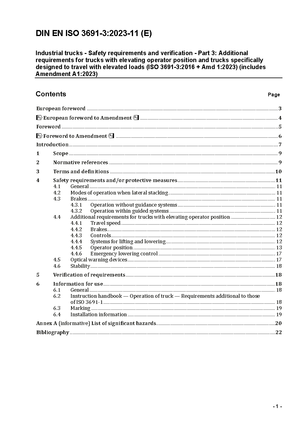 Industrial trucks - Safety requirements and verification - Part 3: Additional requirements for trucks with elevating operator position and trucks specifically designed to travel with elevated load (ISO 3691-3:2016/DAM 1:2021); German and English version EN ISO 3691-3:2016/prA1:2021