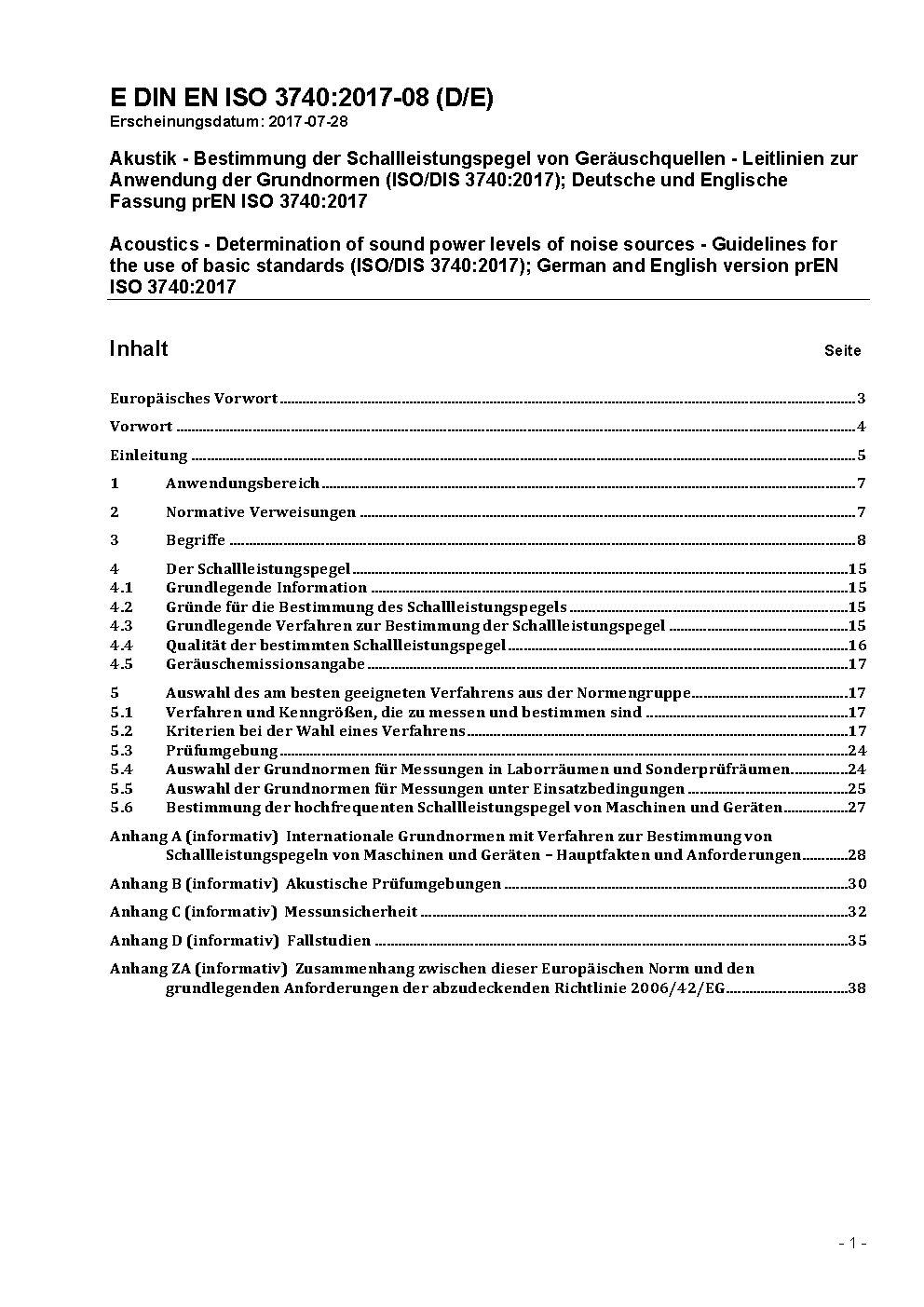 Akustik - Bestimmung der Schallleistungspegel von Geräuschquellen - Leitlinien zur Anwendung der Grundnormen (ISO/DIS 3740:2017); Deutsche und Englische Fassung prEN ISO 3740:2017