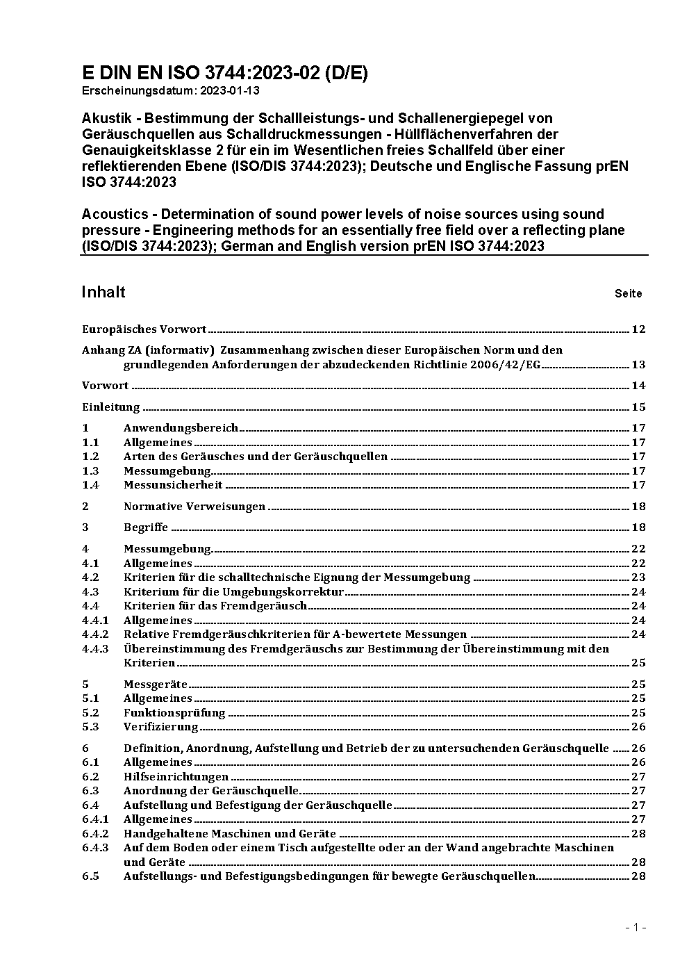 Akustik - Bestimmung der Schallleistungs- und Schallenergiepegel von Geräuschquellen aus Schalldruckmessungen - Hüllflächenverfahren der Genauigkeitsklasse 2 für ein im Wesentlichen freies Schallfeld über einer reflektierenden Ebene (ISO/DIS 3744:2023); Deutsche und Englische Fassung prEN ISO 3744:2023