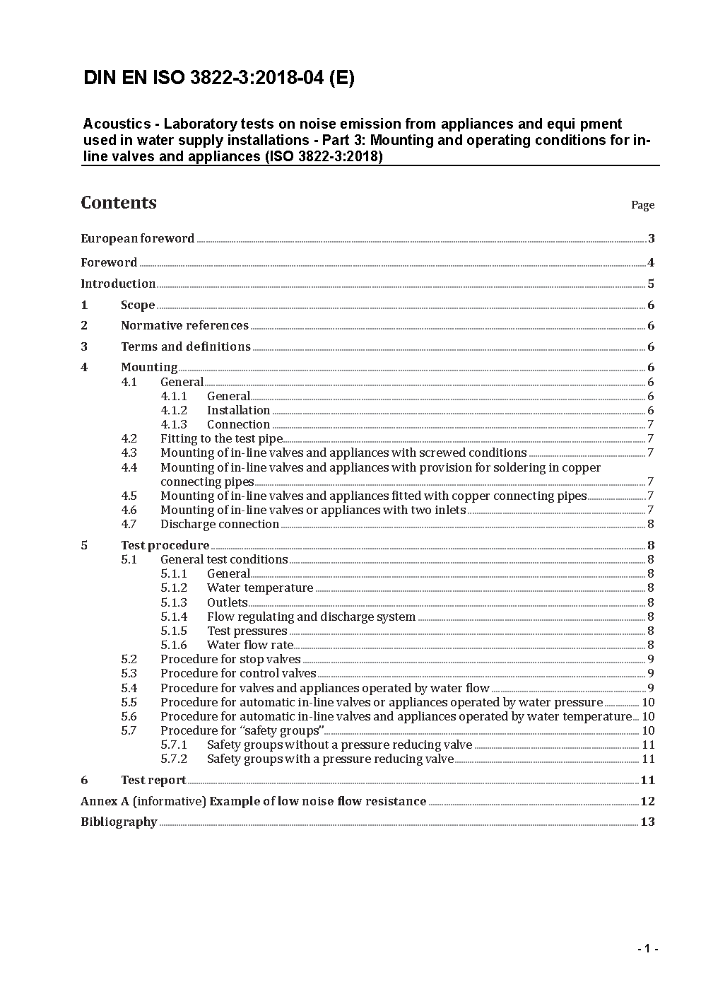 Akustik - Prüfung des Geräuschverhaltens von Armaturen und Geräten der Wasserinstallation im Laboratorium - Teil 3: Anschluss- und Betriebsbedingungen für Durchgangsarmaturen (ISO 3822-3:1997 + Amd 1:2009); Deutsche Fassung EN ISO 3822-3:1997 + A1:2009