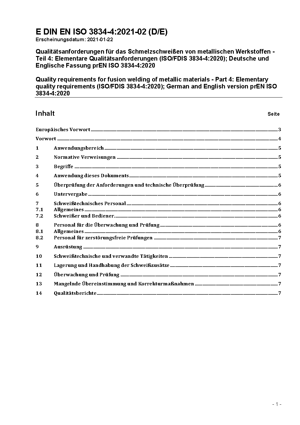 Quality requirements for fusion welding of metallic materials - Part 4: Elementary quality requirements (ISO/FDIS 3834-4:2020); German and English version prEN ISO 3834-4:2020