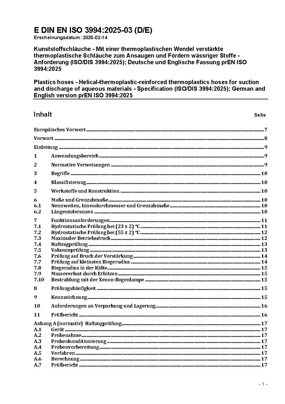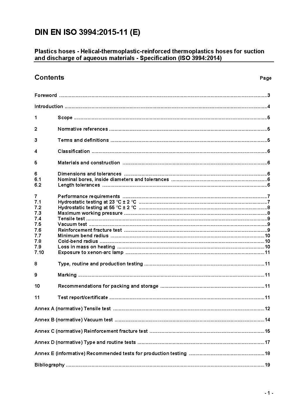 Kunststoffschläuche - Mit einer thermoplastischen Wendel verstärkte thermoplastische Schläuche zum Ansaugen und Fördern wässriger Stoffe - Anforderungen (ISO/DIS 3994:2011); Deutsche Fassung prEN ISO 3994:2011