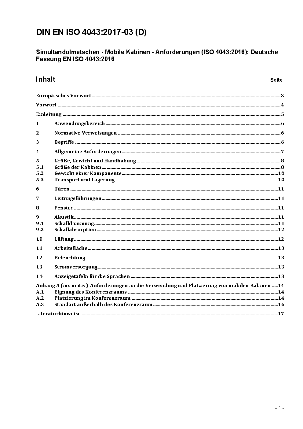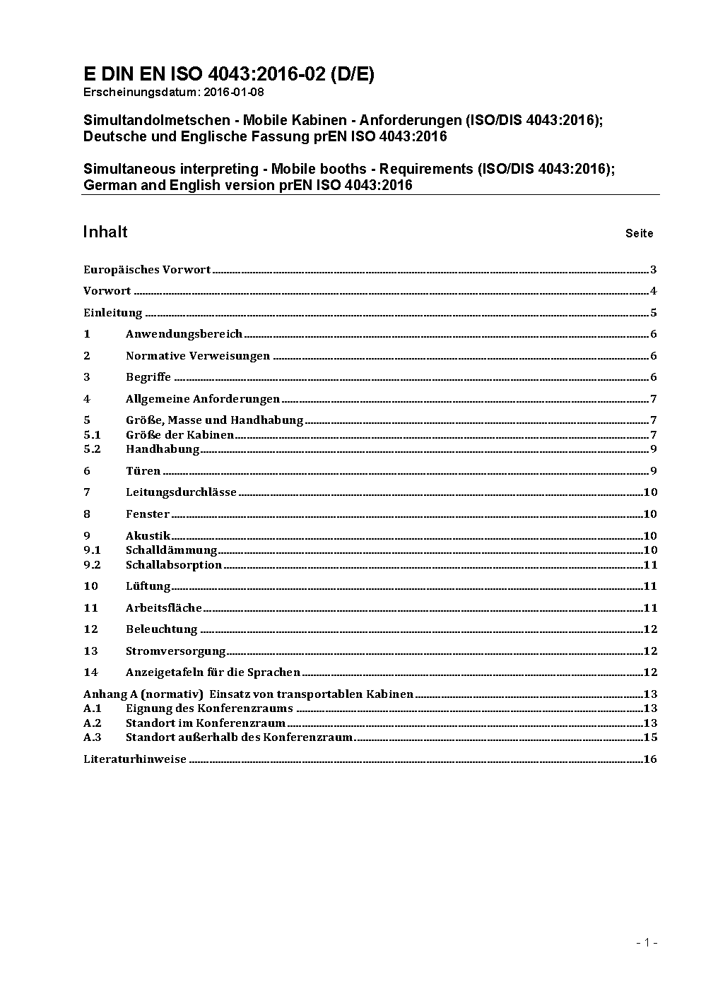 Simultandolmetschen - Mobile Kabinen - Anforderungen (ISO/DIS 4043:2016); Deutsche und Englische Fassung prEN ISO 4043:2016