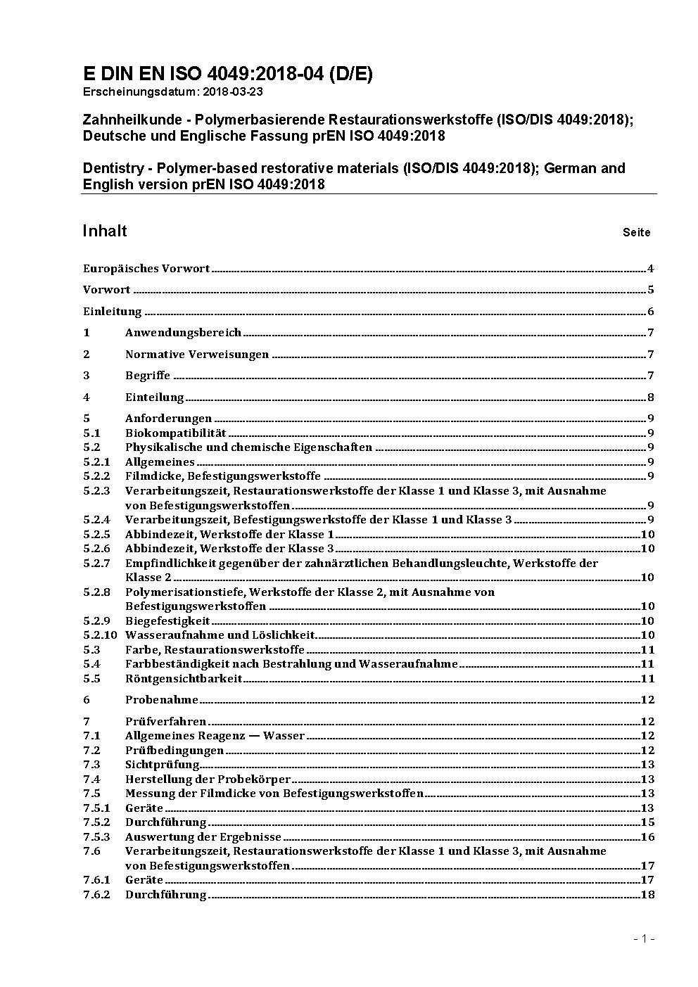 Dentistry - Polymer-based restorative materials (ISO/DIS 4049:2018); German and English version prEN ISO 4049:2018