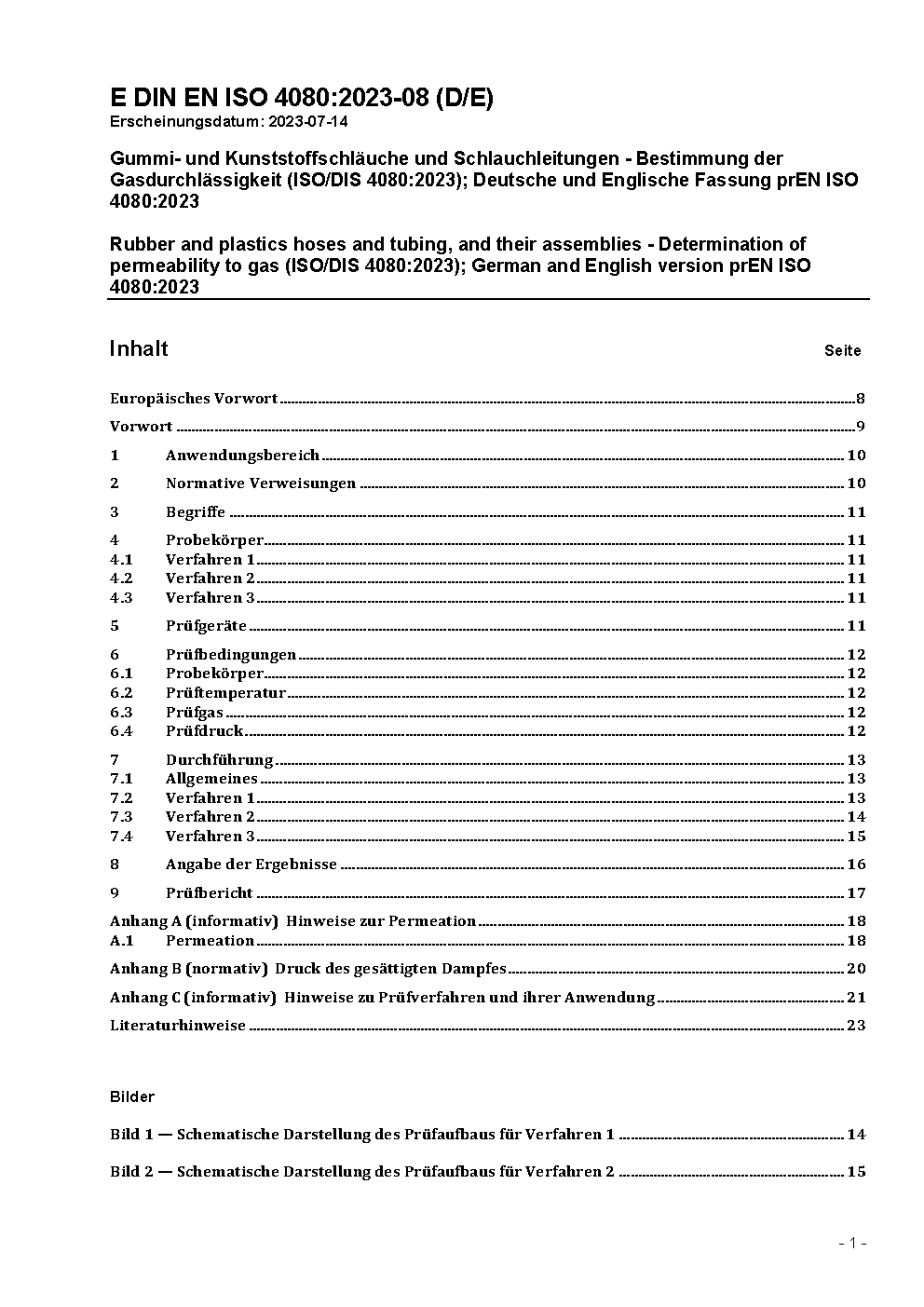 Gummi- und Kunststoffschläuche und Schlauchleitungen - Bestimmung der Gasdurchlässigkeit (ISO/DIS 4080:2023); Deutsche und Englische Fassung prEN ISO 4080:2023