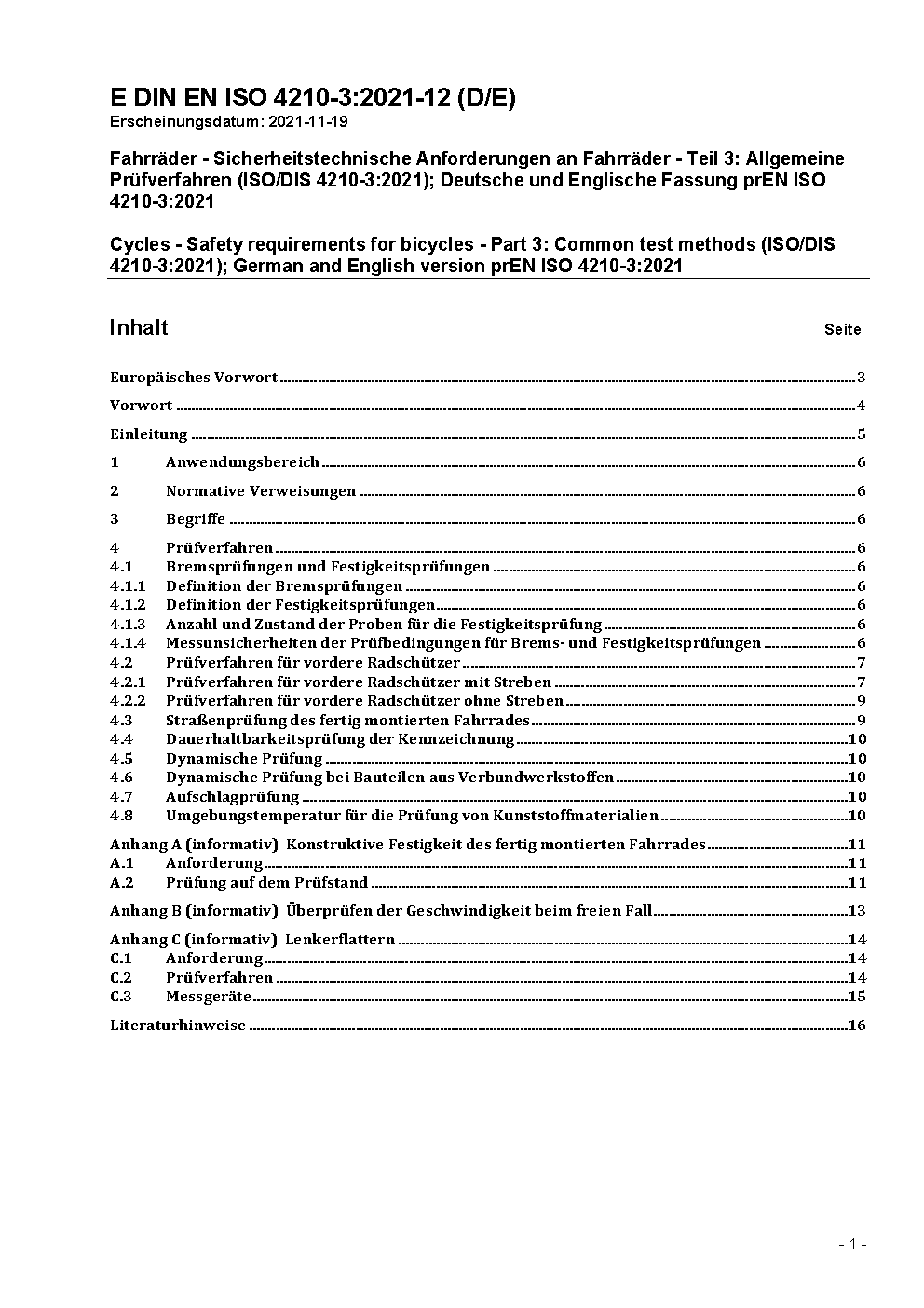 Fahrräder - Sicherheitstechnische Anforderungen an Fahrräder - Teil 3: Allgemeine Prüfverfahren (ISO 4210-3:2014); Deutsche Fassung EN ISO 4210-3:2014 / Achtung: Daneben gelten DIN EN 14764 (2006-03), DIN EN 14766 (2006-09) und DIN EN 14781 (2006-03) noch bis 2015-07-31.