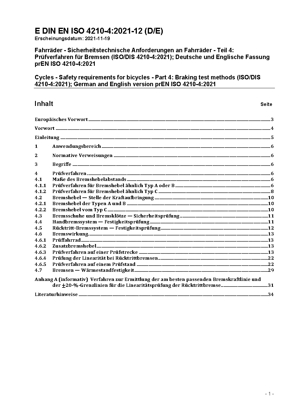 Fahrräder - Sicherheitstechnische Anforderungen an Fahrräder - Teil 4: Prüfverfahren für Bremsen; Deutsche Fassung prEN ISO 4210-4:2012