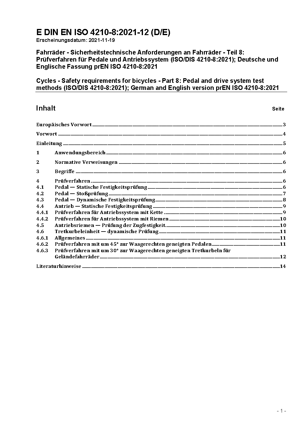 Fahrräder - Sicherheitstechnische Anforderungen an Fahrräder - Teil 8: Prüfverfahren für Pedale und Antriebssystem (ISO 4210-8:2014); Deutsche Fassung EN ISO 4210-8:2014 / Achtung: Daneben gelten DIN EN 14764 (2006-03), DIN EN 14766 (2006-09) und DIN EN 14781 (2006-03) noch bis 2015-07-31.