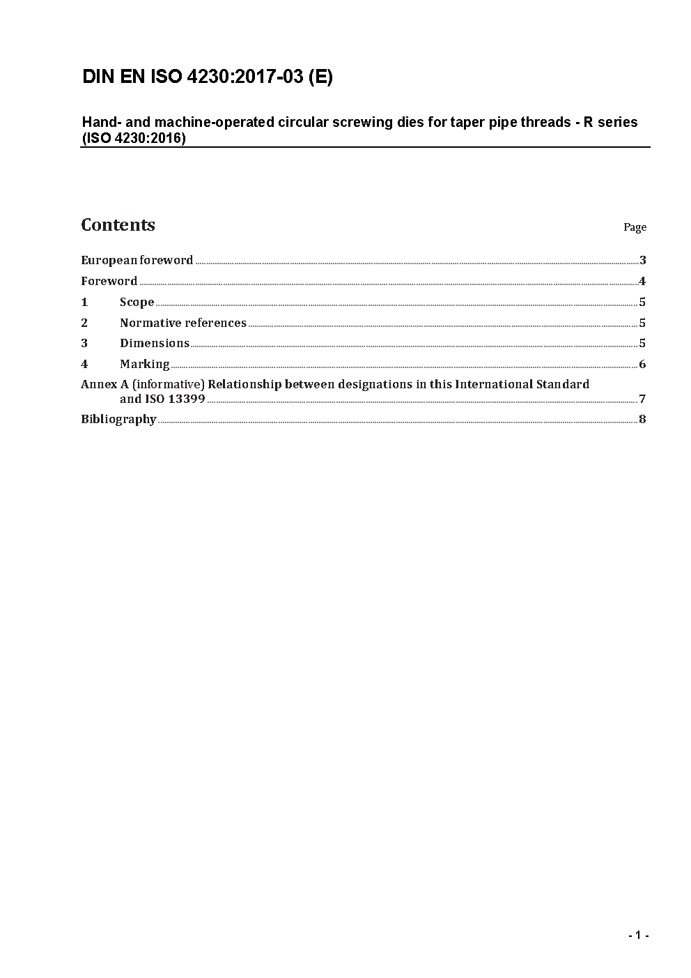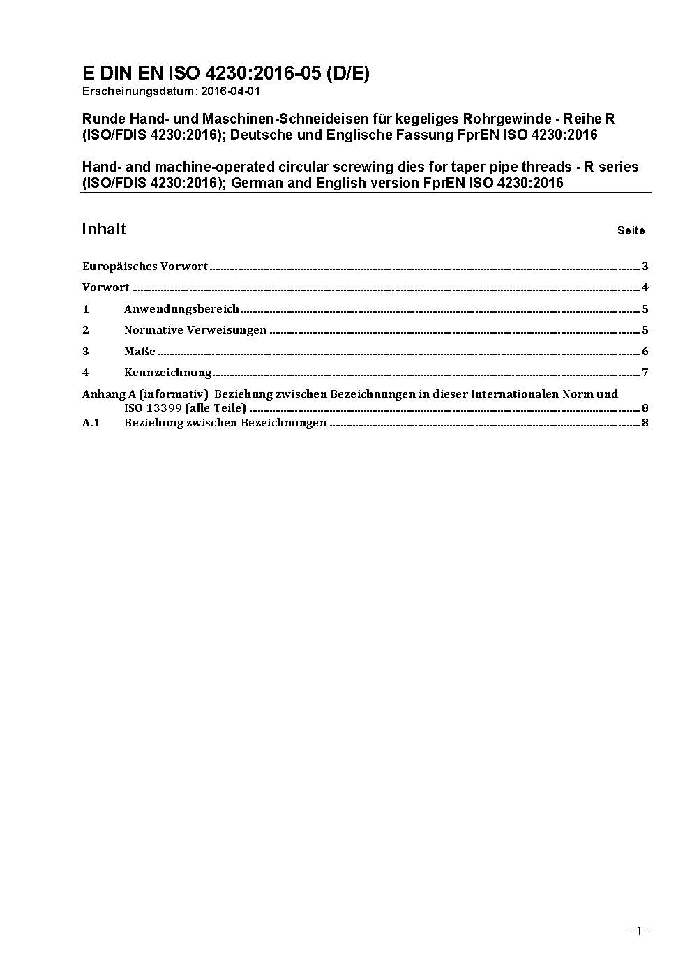 Hand- and machine-operated circular screwing dies for taper pipe threads - R series (ISO 4230:2016); German version EN ISO 4230:2016