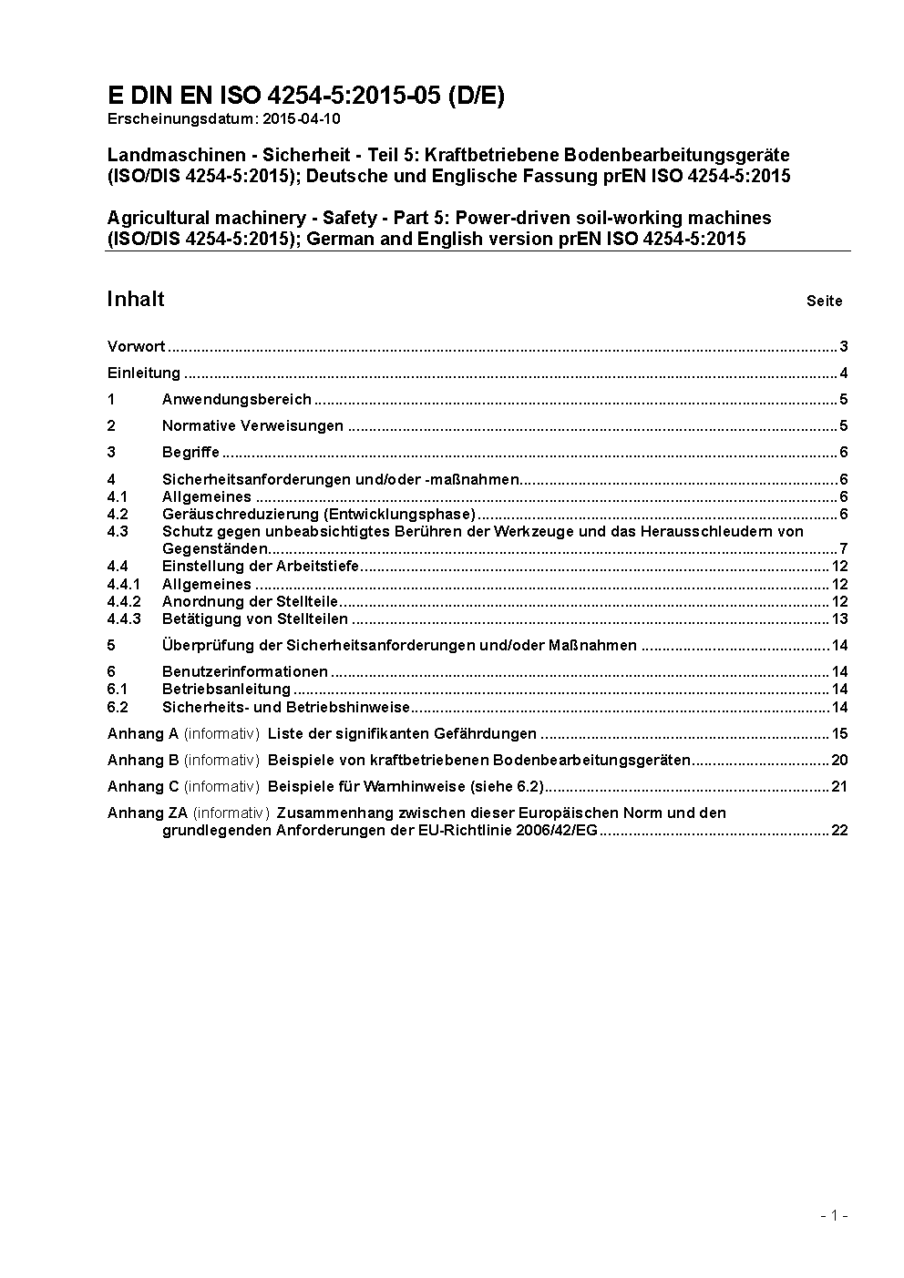 Landmaschinen - Sicherheit - Teil 5: Kraftbetriebene Bodenbearbeitungsgeräte (ISO/DIS 4254-5:2015); Deutsche und Englische Fassung prEN ISO 4254-5:2015
