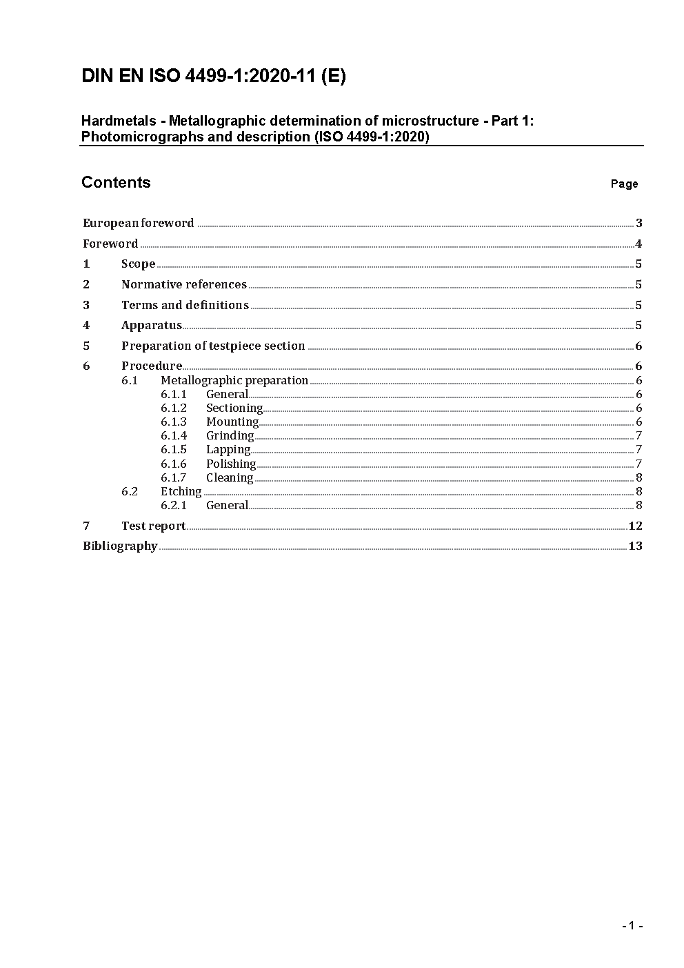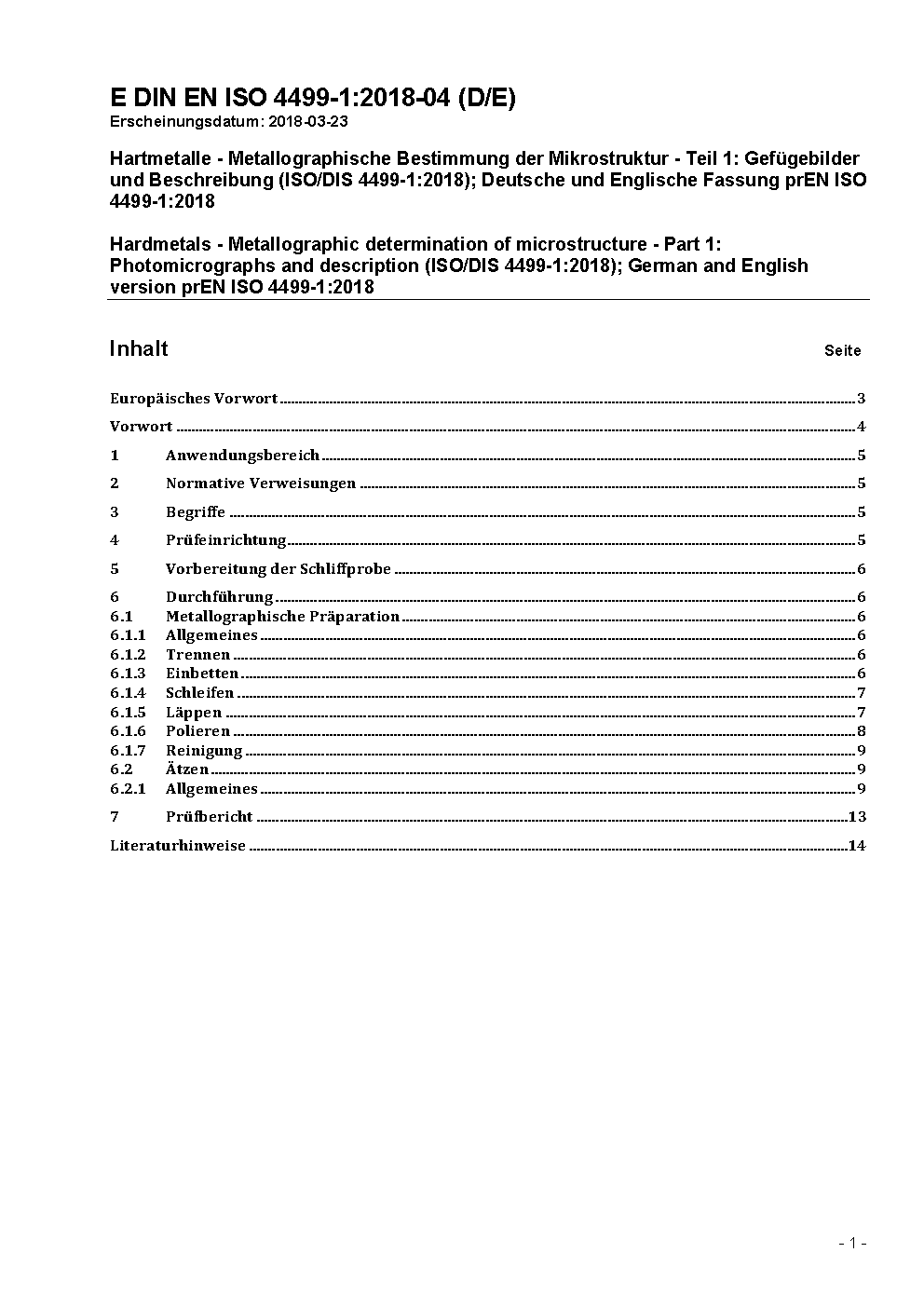 Hartmetalle - Metallographische Bestimmung der Mikrostruktur - Teil 1: Gefügebilder und Beschreibung (ISO 4499-1:2020); Deutsche Fassung EN ISO 4499-1:2020