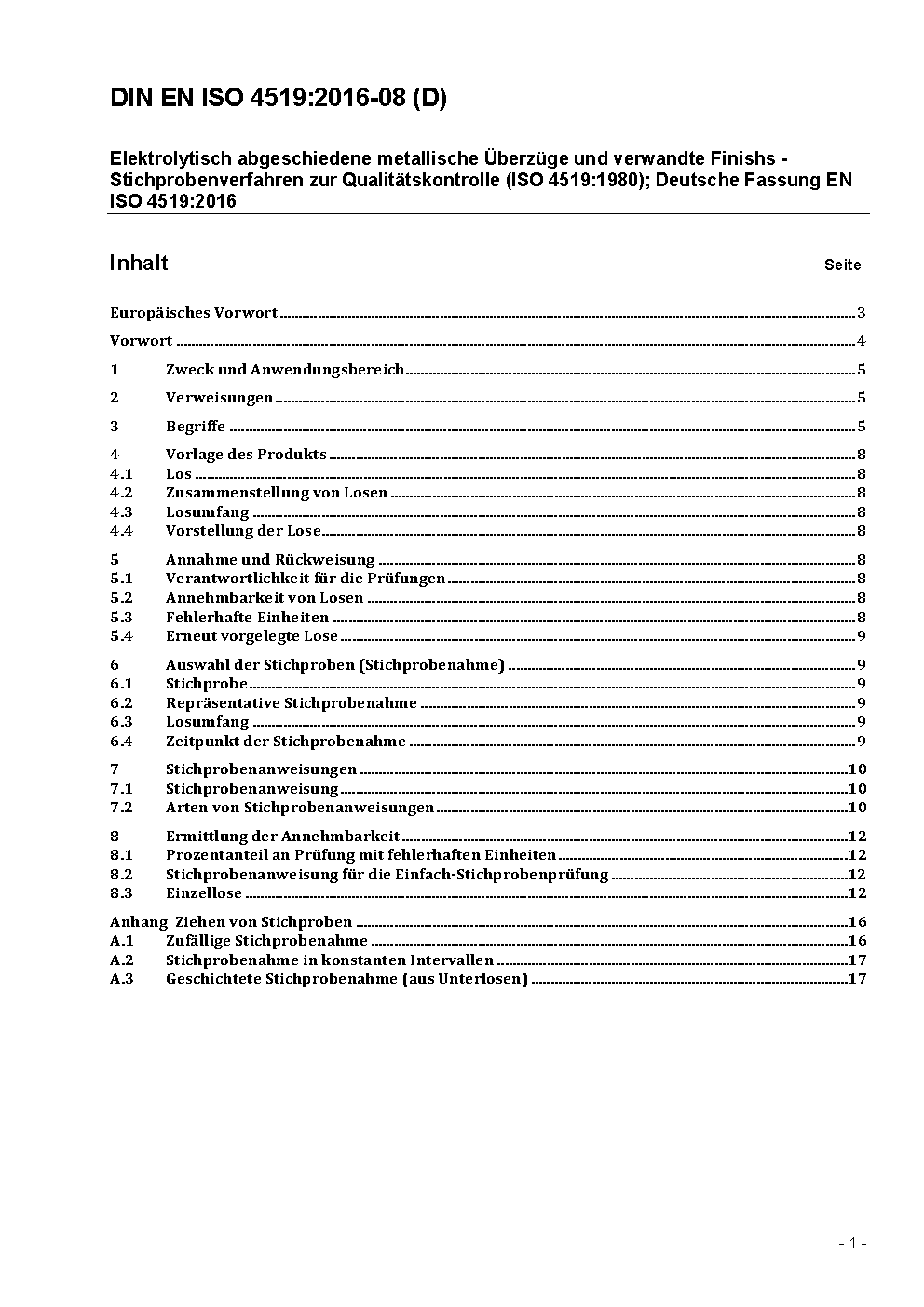Elektrolytisch abgeschiedene metallische Überzüge und verwandte Finishs - Stichprobenverfahren zur Qualitätskontrolle (ISO 4519:1980); Deutsche Fassung EN ISO 4519:2016