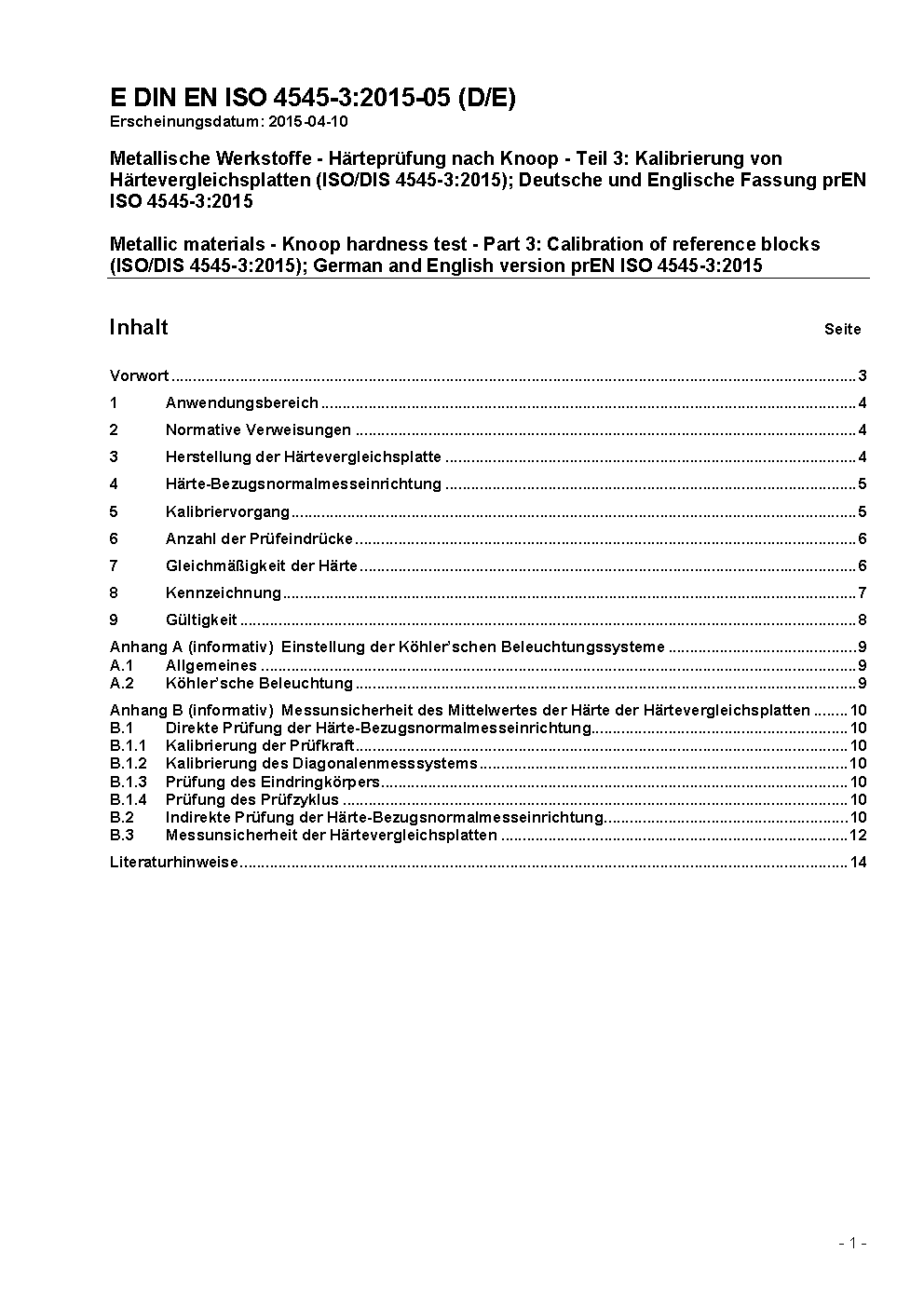 Metallic materials - Knoop hardness test - Part 3: Calibration of reference blocks (ISO/DIS 4545-3:2015); German and English version prEN ISO 4545-3:2015