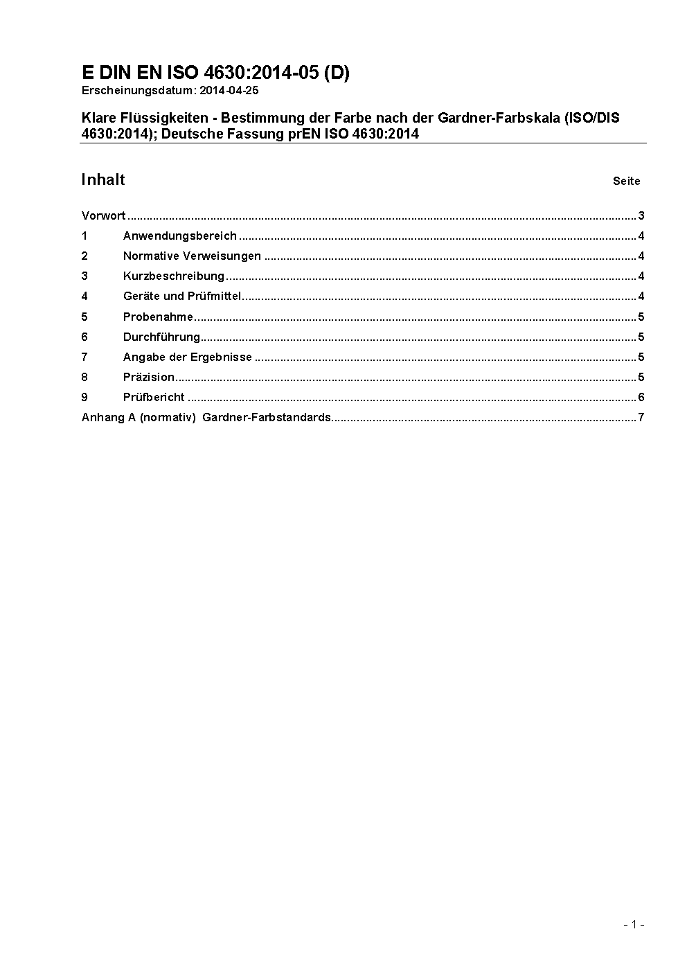 Klare Flüssigkeiten - Bestimmung der Farbe nach der Gardner-Farbskala (ISO/DIS 4630:2014); Deutsche Fassung prEN ISO 4630:2014
