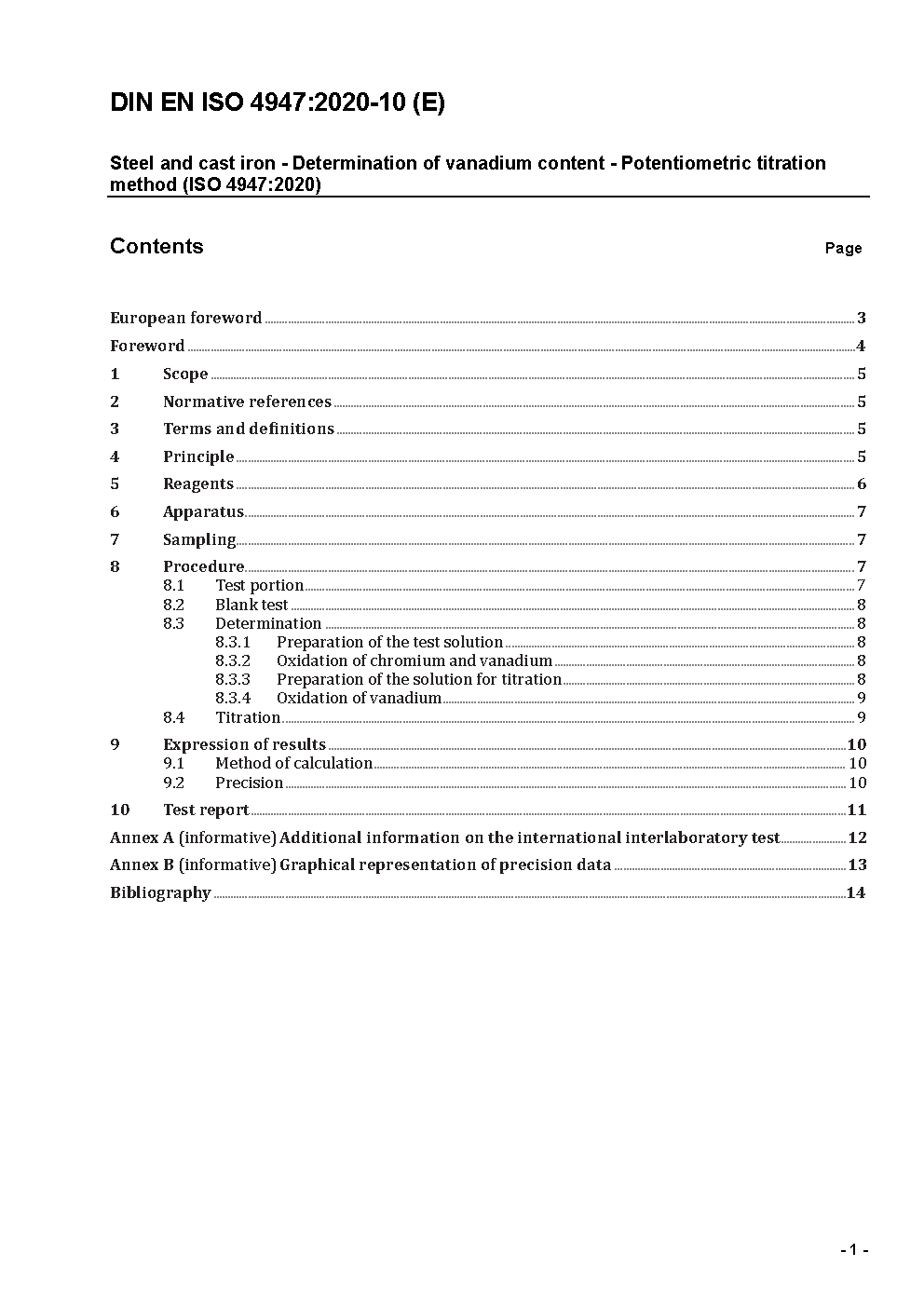 Steel and cast iron - Determination of vanadium content - Potentiometric titration method (ISO 4947:2020); German version EN ISO 4947:2020