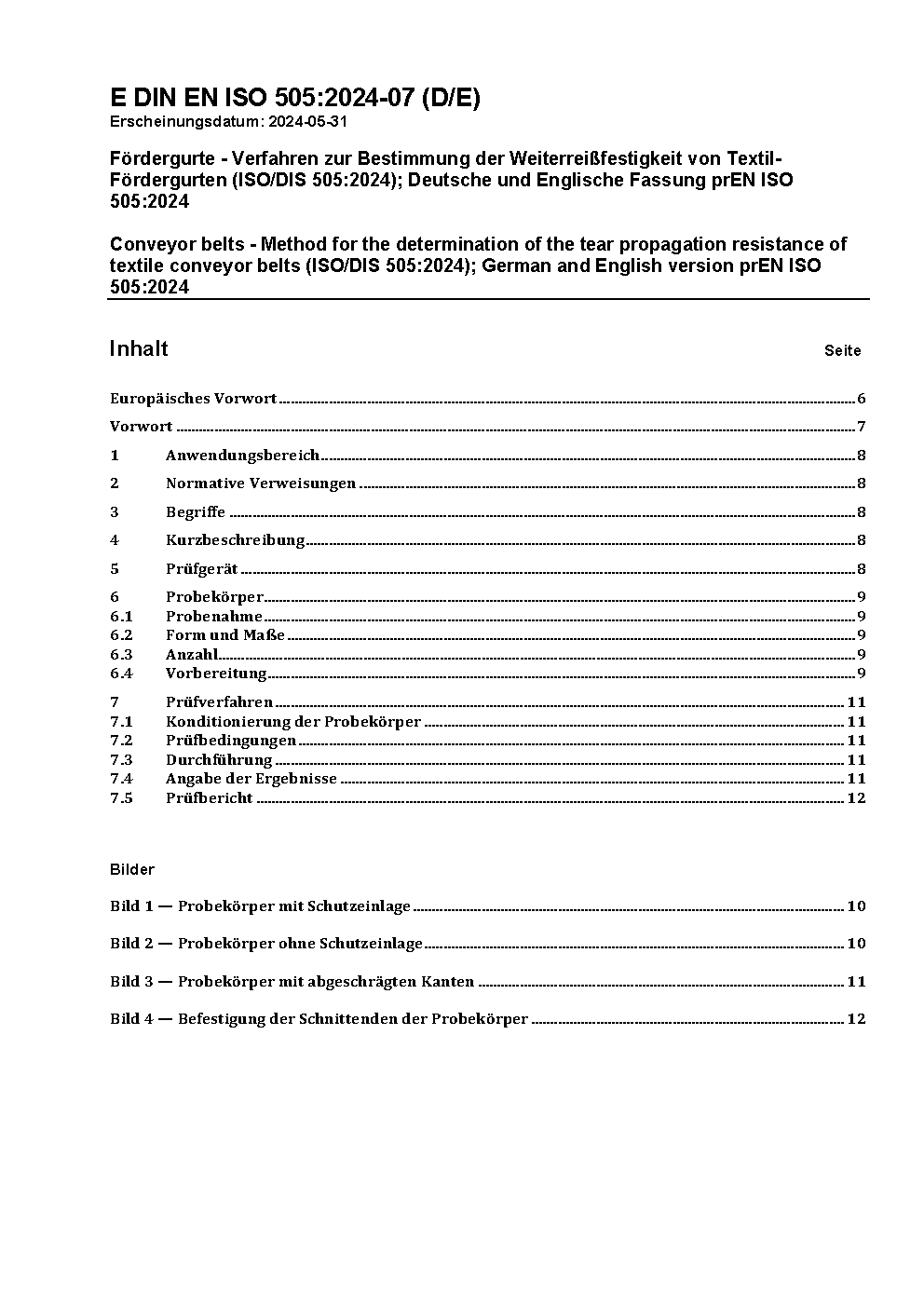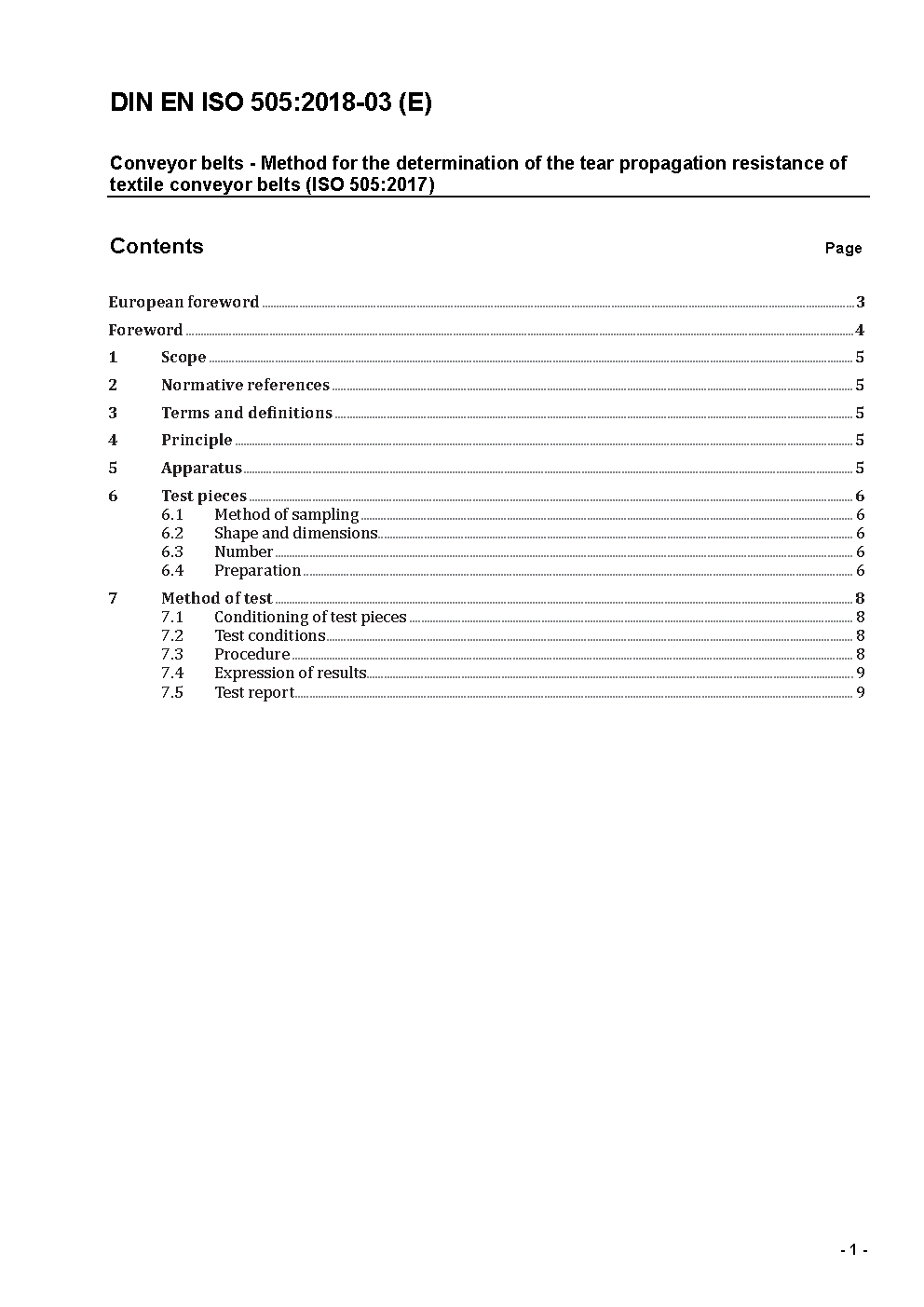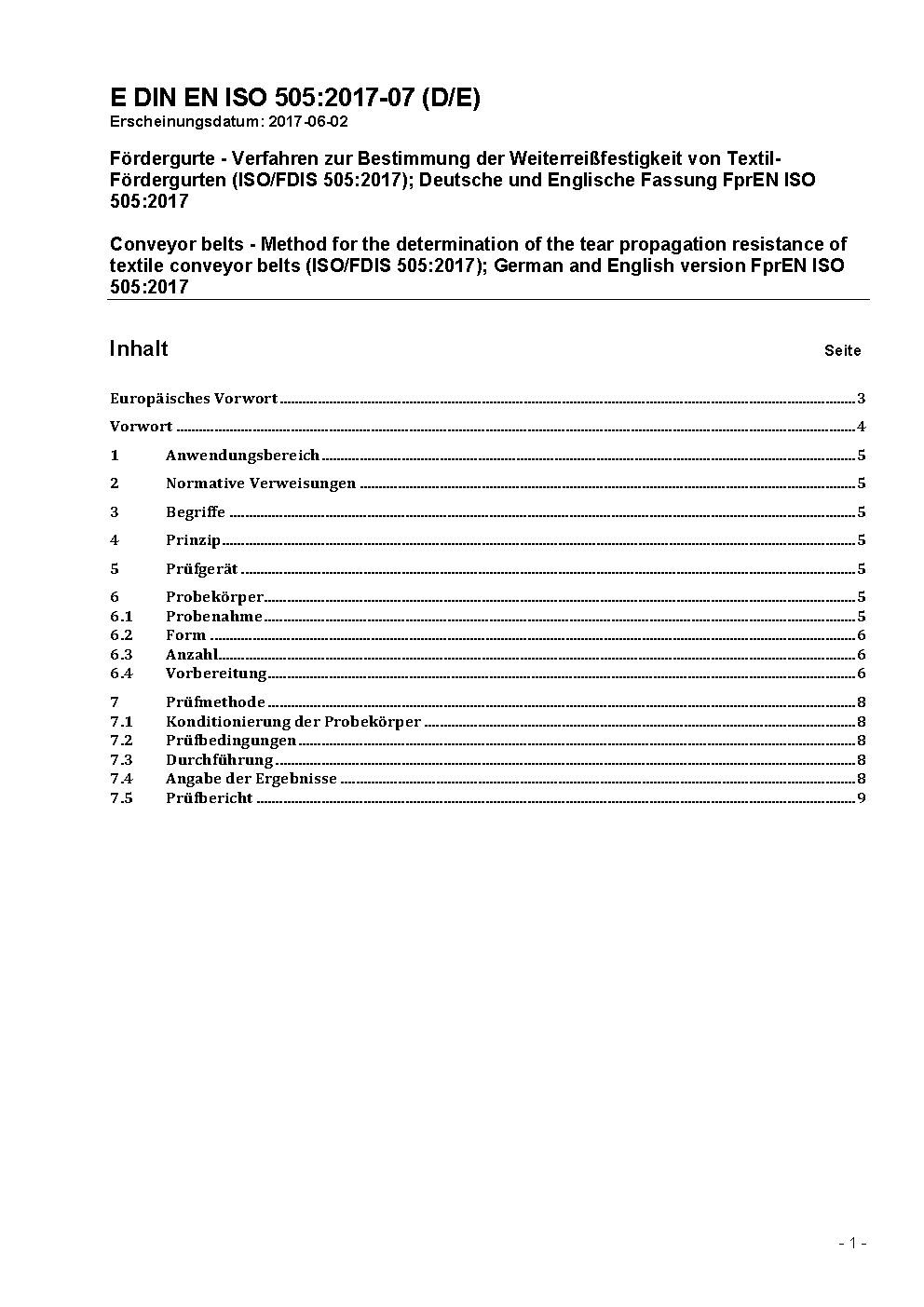 Conveyor belts - Method for the determination of the tear propagation resistance of textile conveyor belts (ISO 505:1999); German version EN ISO 505:1999