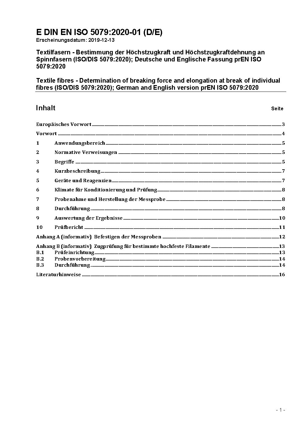 Textilien - Fasern - Bestimmung der Höchstzugkraft und Höchstzugkraftdehnung an Spinnfasern (ISO 5079:1995); Deutsche Fassung EN ISO 5079:1995