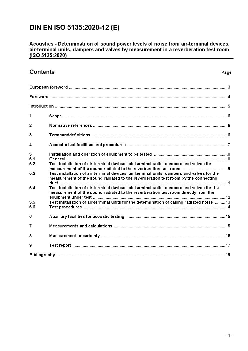 Acoustics - Determination of sound power levels of noise from air-terminal devices, air-terminal units, dampers and valves by measurement in a reverberation room (ISO 5135:1997); German version EN ISO 5135:1998