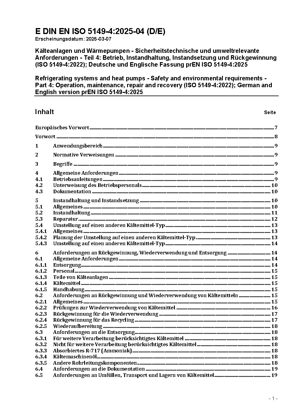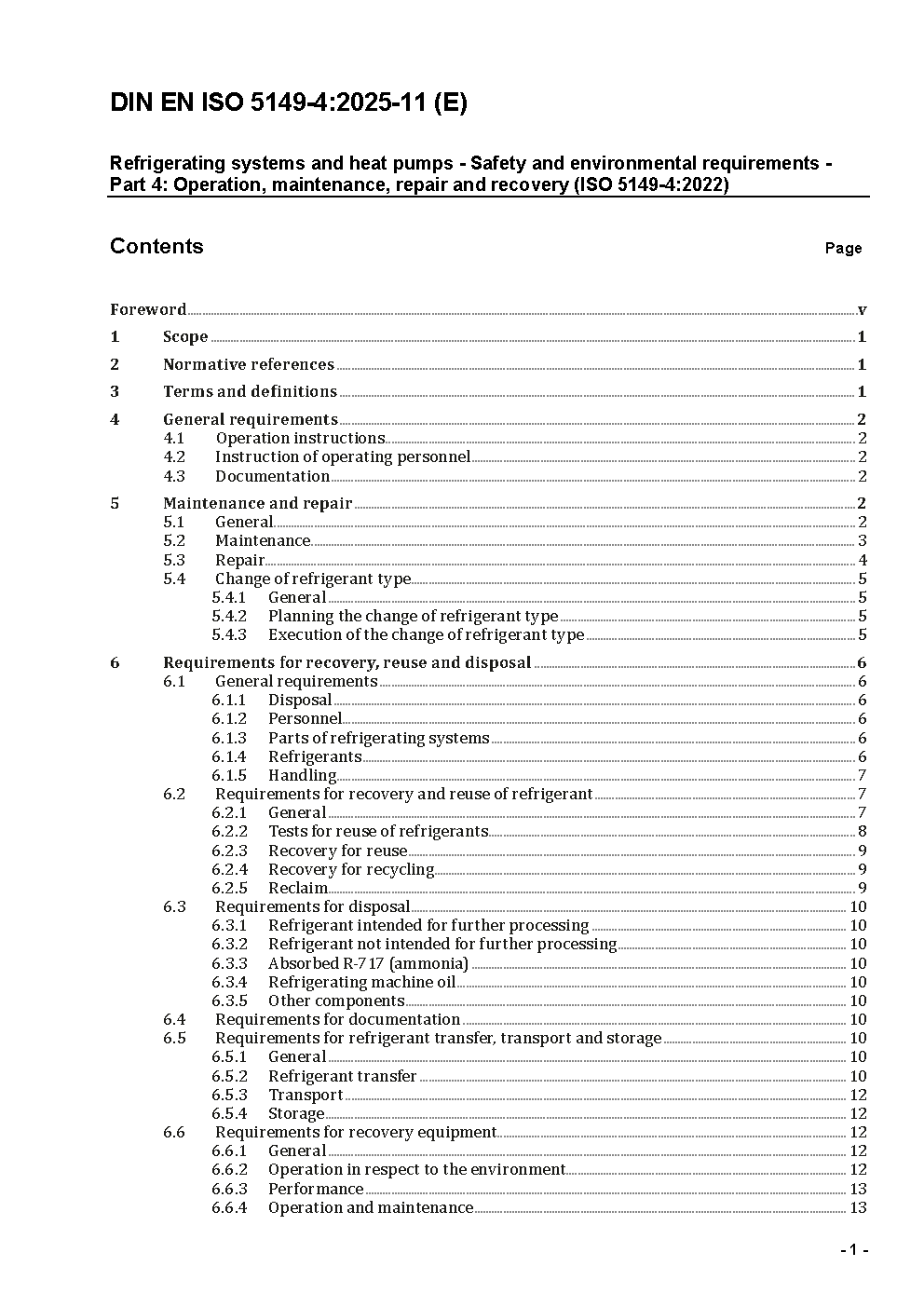 Refrigerating systems and heat pumps - Safety and environmental requirements - Part 4: Operation, maintenance, repair and recovery (ISO 5149-4:2022); German version EN ISO 5149-4:2025