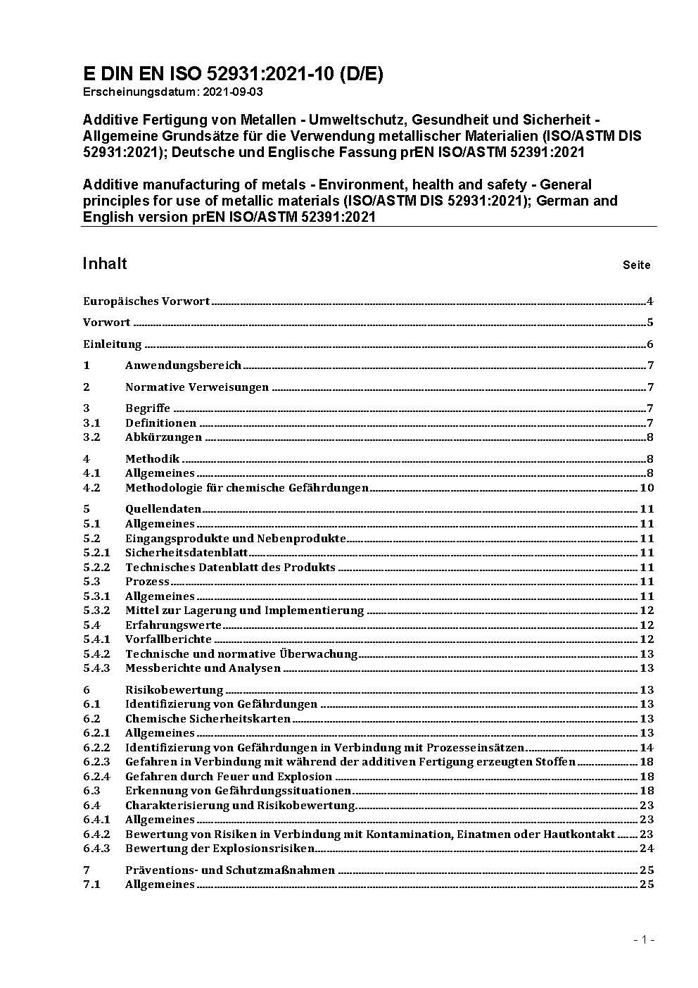 Additive manufacturing of metals - Environment, health and safety - General principles for use of metallic materials (ISO/ASTM DIS 52931:2021); German and English version prEN ISO/ASTM 52391:2021