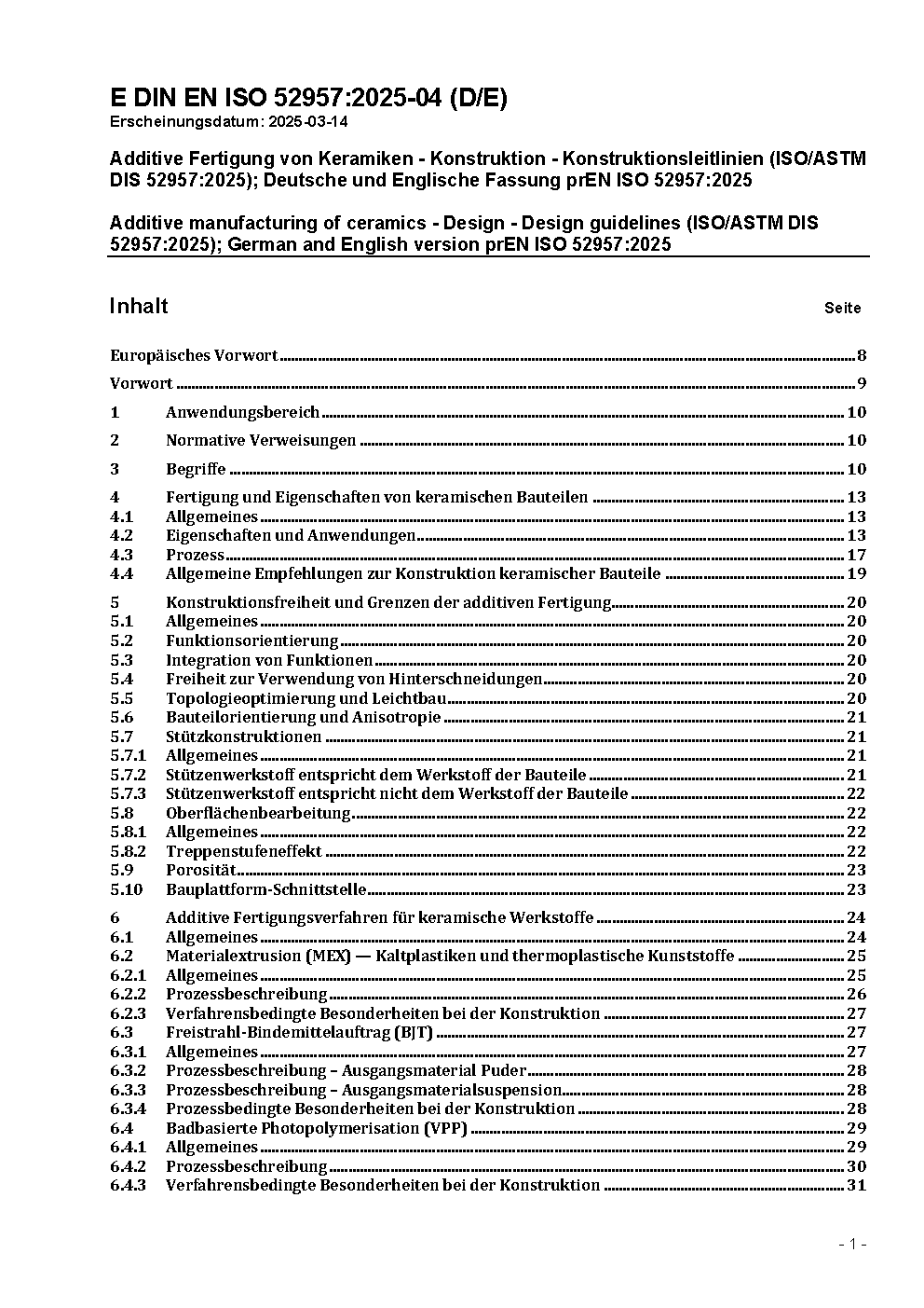 Additive Fertigung von Keramiken - Konstruktion - Konstruktionsleitlinien (ISO/ASTM DIS 52957:2025); Deutsche und Englische Fassung prEN ISO 52957:2025