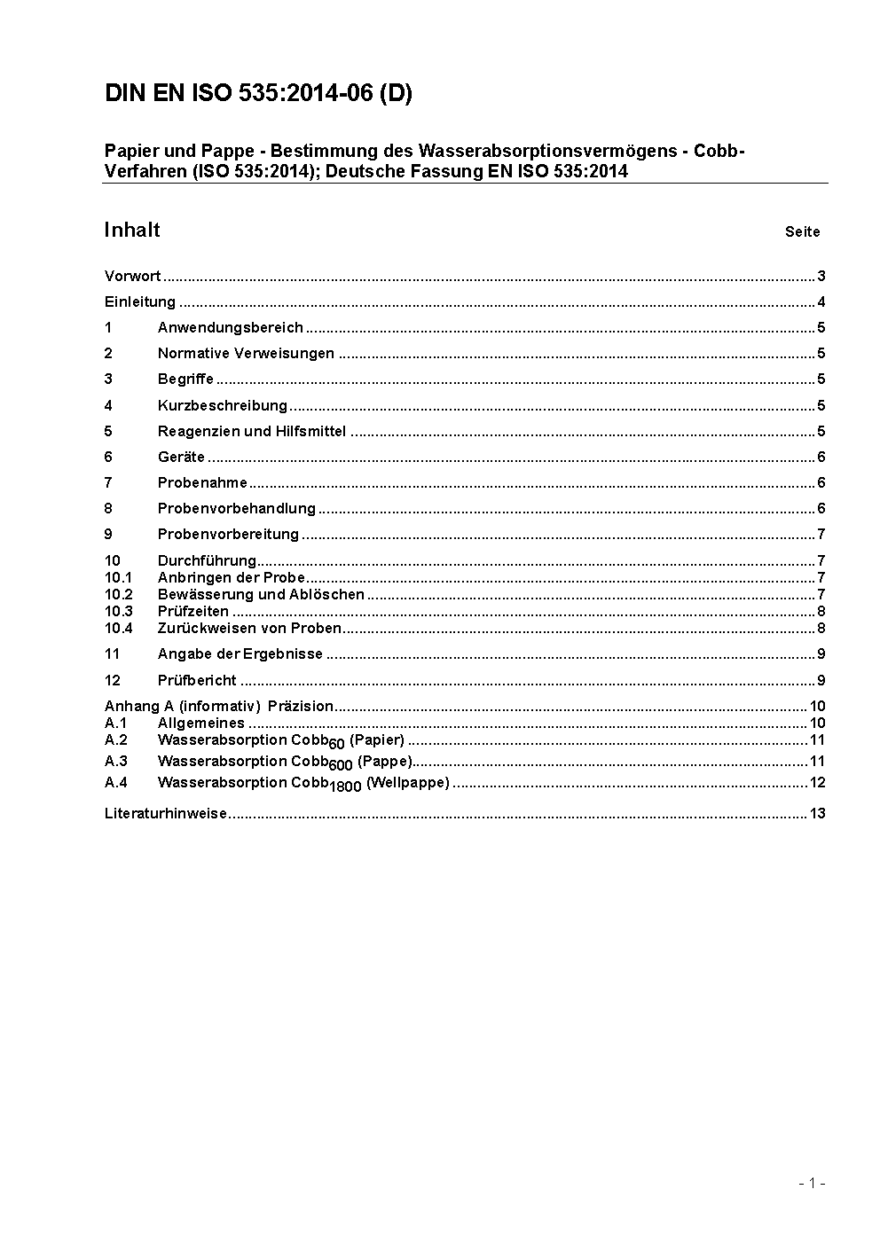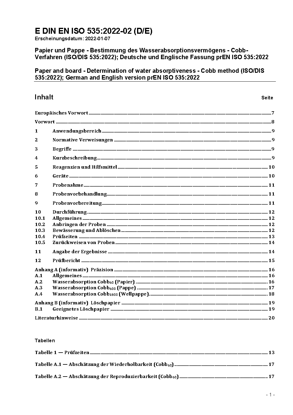 Papier und Pappe - Bestimmung des Wasserabsorptionsvermögens - Cobb-Verfahren (ISO/DIS 535:2022); Deutsche und Englische Fassung prEN ISO 535:2022