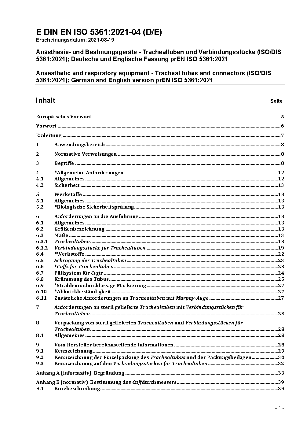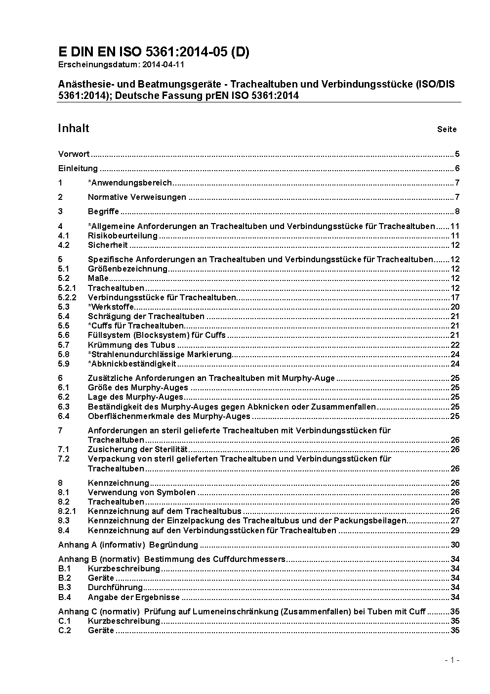 Anästhesie- und Beatmungsgeräte - Trachealtuben und Verbindungsstücke (ISO 5361:2016); Deutsche Fassung EN ISO 5361:2016 / Achtung: Daneben gilt DIN EN ISO 5361 (2013-03) noch bis 2019-09-30.