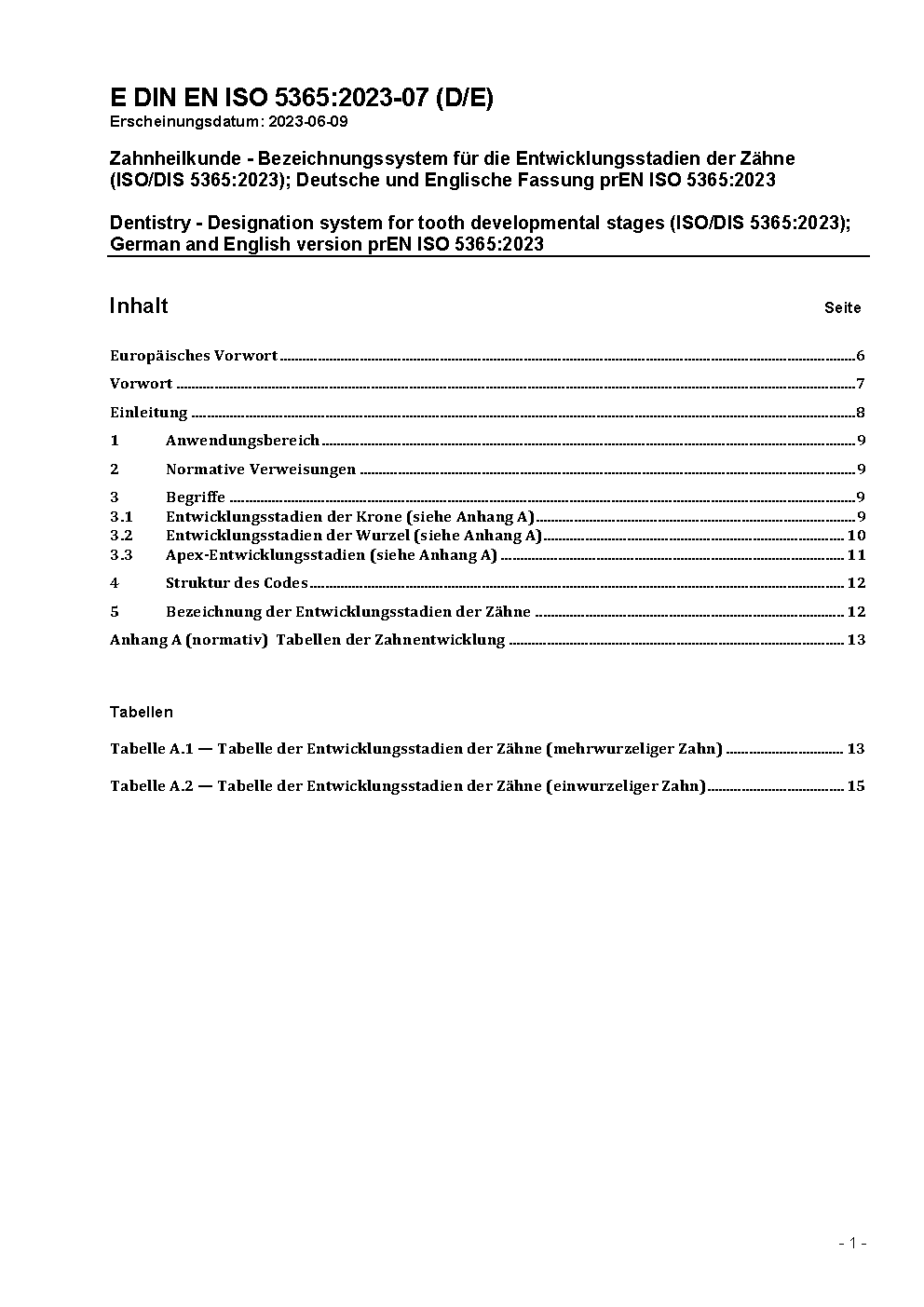 Dentistry - Designation system for tooth developmental stages (ISO/DIS 5365:2023); German and English version prEN ISO 5365:2023